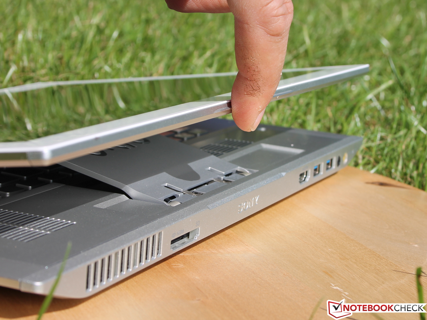 Die FHD-Anzeige bedient sich aus dem Stand reaktionsschnell und ohne weitere Kalibrierungen. Wir sind überrascht, wie zielgenau selbst große Finger die kleinen Buttons und Menüpunkte der hohen Auflösung treffen können. Durch das mittig stützende Gelenk gibt das Panel auch beim heftigen Drauftippen kein Stück nach. Ein Einstellen des Aufklappwinkels ist beim Duo 13 nicht vorgesehen. Andere Convertibles oder Touch-Subnotebooks lassen hierbei gerne mal das TFT wippen oder nach hinten wegklappen. Der stabile Arbeitsmodus (Laptop-Format) ist ein einzigartiges Features der Vaios Duo 11 und 13.