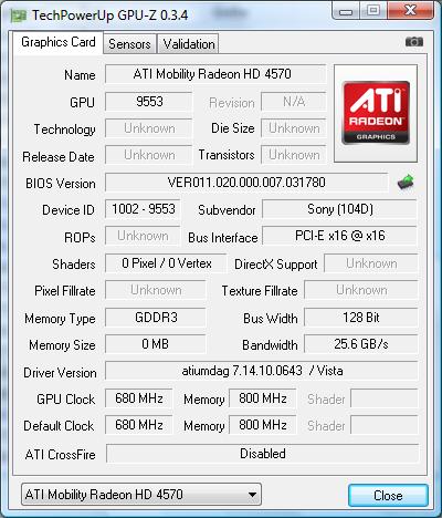 Für Grafikberechnung kommt im Sony Vaio VGN-SR41S/M eine Mobility Radeon HD 4570 von ATI zum Einsatz, eine DirectX 10.1 fähige Einsteiger-Mittelklasse Grafikkarte für Notebooks. Diese eigenständige Grafikkarte mit 64-Bit Speicherbus, ist mit unterschiedlicher Speicherausstattung, GDDR3, DDR2 oder DDR3 erhältlich. Jene im Testgerät war mit GDD3 Speicher bestückt. GDDR Speicher ist mit 32-Bit Bus schneller als DDR Speicher mit 16-Bit Verbindung, im Einkauf jedoch auch deutlich teurer.