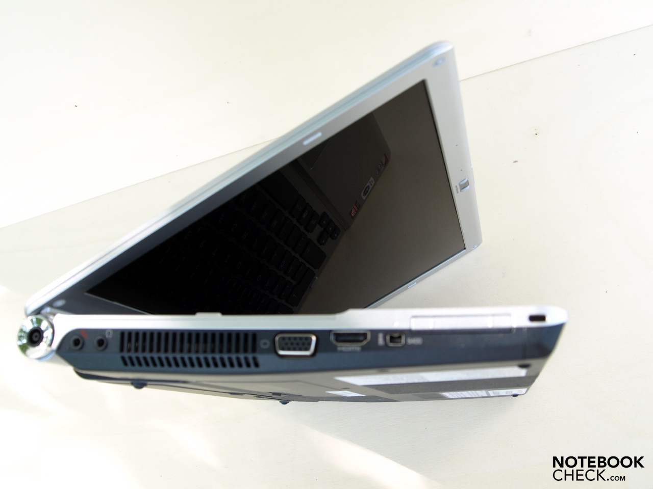 Mit nur 2 USB-2.0 Schnittstellen kann man die Schnittstellenausstattung durchaus als etwas spärlich bezeichnen. Beide befinden sich an der rechten Seitenkante im hinteren Bereich. Dahinter wurden unter einer Plastikabdeckung RJ-11 (Modem) und RJ-45 (LAN) Anschlüsse verborgen. Nach vorne zu setzt die rechte Seite mit dem optischen Laufwerk fort. Damit ergibt sich alles in allem eine brauchbare Schnittstellenanordnung für Rechtshänder.