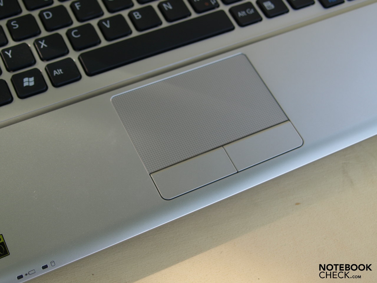 Das etwas tieferliegende Touchpad fällt mit einer Breite von 82 Millimetern und einer Höhe von 49 Millimetern ansprechend groß aus. Seine Gleiteigenschaften sind ausgezeichnet, sodass ein präzises Steuern der Mauszeigers problemlos möglich ist. Die zugehörigen Buttons bleiben im Test ohne Auffälligkeiten. Sie sprechen über ihre gesamte Fläche tadellos an und arbeiten auch nicht zu laut, wenngleich auch nicht flüsterleise.