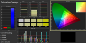 Im Auslieferungszustand haben wir den Bildschirm vermessen (Zielfarbraum sRGB). Die DeltaE-2000-Abweichung der meisten Farben liegt unter dem Wert von 10. Einige erreichen auch den Zielbereich (DeltaE kleiner 5). Das Display verfügt über einen deutlichen Blaustich.