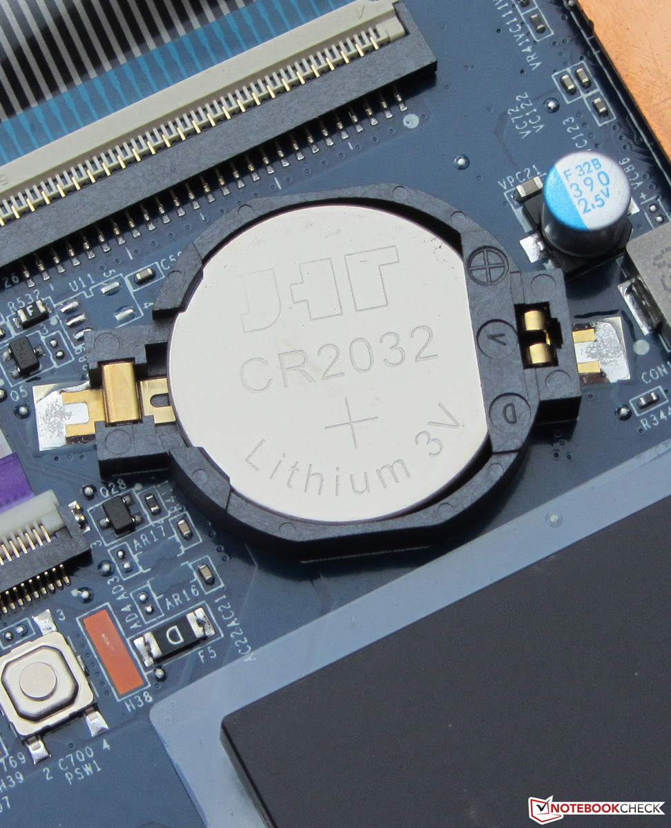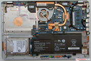 Nach Entfernung der Unterseite, ist der Zugriff auf den Arbeitsspeicher, die Festplatte, die BIOS-Batterie, den Akku, das WLAN-Modul und den Lüfter gegeben. Letzterer könnte zwecks Reinigung ausgebaut werden. Das Notebook verfügt über eine Arbeitsspeicherbank, die mit einem vier-Gigabyte-Modul belegt ist. Wird das Modul entfernt, finden sich vier weitere Gigabyte Arbeitsspeicher, die auf der Hauptplatine verlötet sind. Ein Tausch der Festplatte wäre kein Problem. Es passen alle handelsüblichen 2,5-Zoll-Festplatten (Bauhöhe: 7 mm und 9,5 mm) in den Rechner. Der Akku könnte im Falle eines Defekts ebenfalls einfach ersetzt werden. Er wird von vier Schrauben gehalten. Die Verbindung mit der Hauptplatine wird durch Steckkontakte hergestellt. Unter dem Akku sitzt das WLAN-Modul.