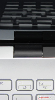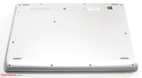 Die Stabilität der Baseunit dürfte bei einem 1.000-Euro-Rechner besser ausfallen. Wird Druck auf das Gehäuse links und rechts der Tastatur ausgeübt, biegt sich dieses etwas durch. Gleiches gilt für den Bereich unterhalb des Touchpads. Auch die Verwindungssteifigkeit lässt zu wünschen übrig. Die Baseunit kann etwas zu stark verdreht werden. Gelegentlich vernimmt man dabei ein Knarzen. Auch der Deckel kann trotz der Metallrückseite mit wenig Kraftaufwand verdreht werden. Die Rückseite kann zudem an mehreren Stellen so stark eingedrückt werden, dass Bildveränderungen sichtbar werden. Die Scharniere halten den Deckel fest in Position. Eine Ein-Hand-Öffnung des Deckels ist nicht möglich.