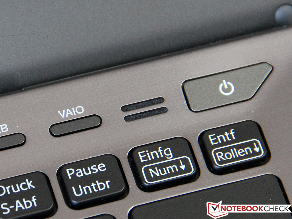 Die von anderen Modellen wie dem VPC-SA3X9E bekannte Chiclet-Tastatur mit Hintergrundbeleuchtung fügt sich nahtlos in die Basiseinheit des Notebooks ein. Der schwarze Kunststoff überzeugt mit einer hochwertigen, leicht gummierten Haptik und bietet trotz seiner glatten Oberfläche einen hohen Grip auf den rund 15 x 15 Millimeter großen Buchstaben. Auf einen Ziffernblock muss aus Platzgründen leider verzichtet werden, dafür gibt es oberhalb der Tastatur drei praktische Schnelltasten (Diagnose-Software Vaio Care, Browser, Start einer vordefinierten Anwendung).