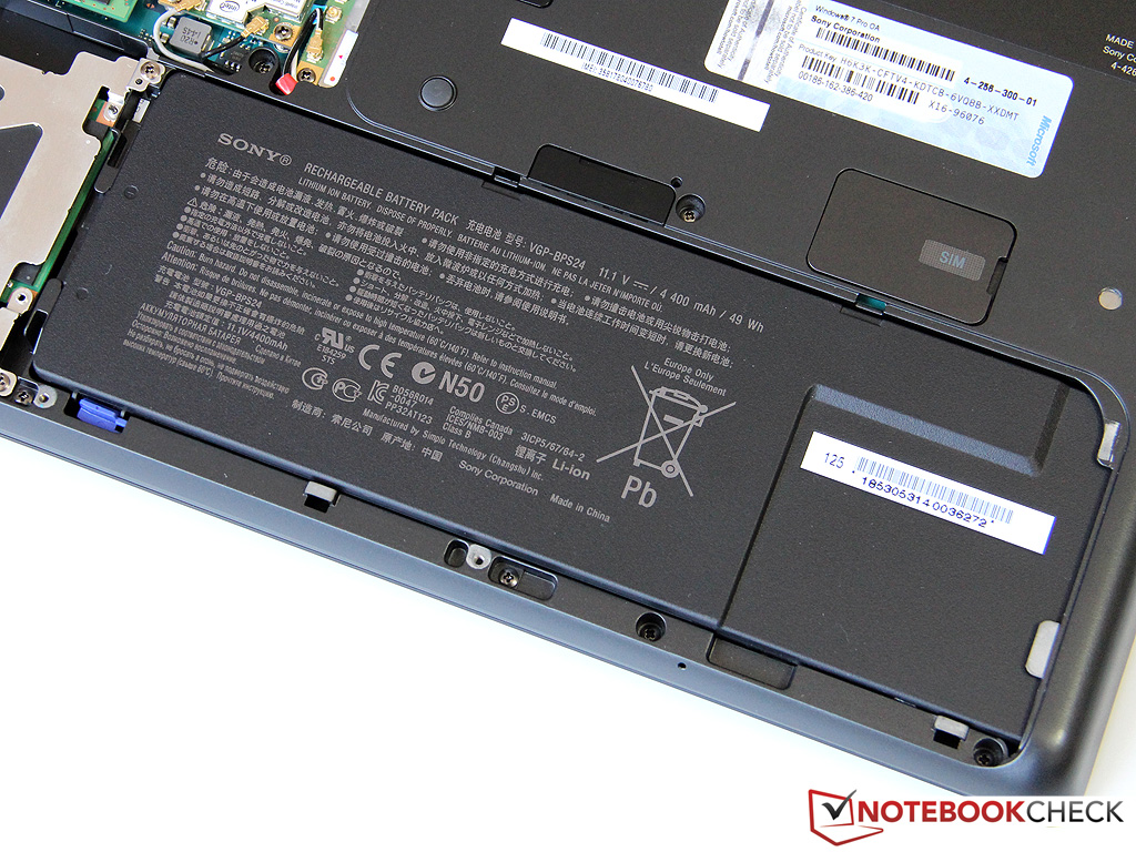 Sony hat einen 49-Wh-Akku fest in das Gehäuse des Vaio integriert. Der Hersteller verspricht damit eine Laufzeit von bis zu 6 Stunden, die sich durch einen optional erhältlichen Akku-Slice auf insgesamt 12 Stunden verlängern lassen soll. Ein solcher stand uns für diesen Test leider nicht zur Verfügung.