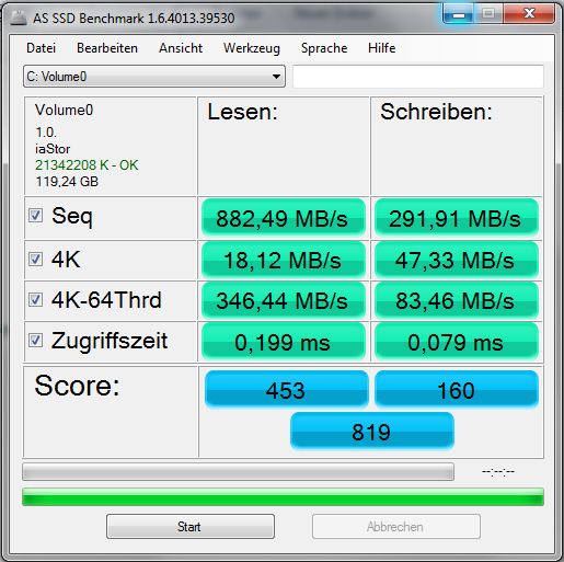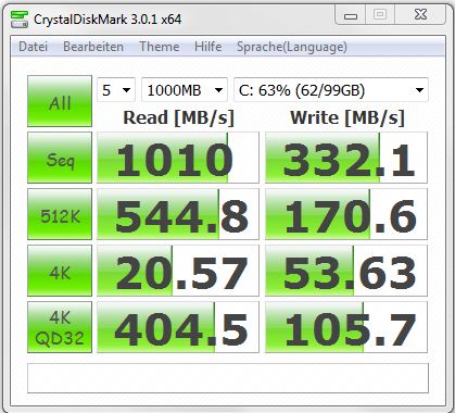 Die SSD ist rasend schnell. Der Speicher reagiert schnell und ohne Verzögerung. Windows 7 wird schnell gestartet. Die Lesegeschwindigkeit liegt bei knapp 900 MB/s - ein sehr guter Wert. Die Schreibrate liegt bei knapp 300 MB/s. Dieser Wert enttäuscht ein wenig, denn wir haben schon SSDs getestet, die höhere Schreibraten lieferten und dabei nicht in einem RAID-0-Verbund steckten.