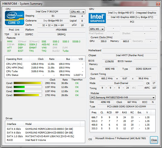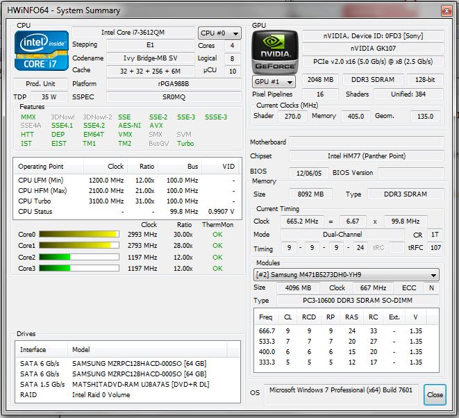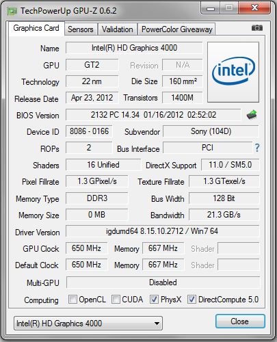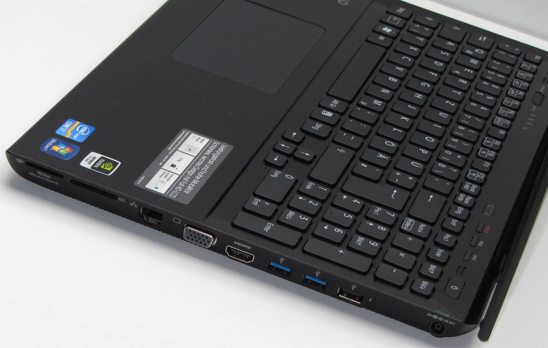 Unser Testgerät wird von einem Intel-Vierkernprozessor (Intel Core i7-3612QM) angetrieben. Die Grafikausgabe erledigen ein Nvidia-Grafikchip (Nvidia GeForce GT 640M LE) und ein Intel-Grafikchip (Intel HD Graphics 4000). Daten werden auf einer 128 GB fassenden Solid State Disk gespeichert. Sony spendiert dem Gerät acht Gigabyte Arbeitsspeicher und einen DVD-Brenner (Slot-in-Laufwerk).