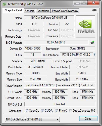 Während unseres Volllasttest (dabei absolviert das Notebook die Tests "Prime95" und "Furmark" gleichzeitig) läuft der GeForce GT 640M LE-Chip sowohl im Netz- als auch im Akkubetrieb dauerhaft mit einer Geschwindigkeit von 500 MHz. Die GPU throttelt zwar nicht, nutzt aber auch nicht die maximal mögliche Geschwindigkeit von 570 MHz. Man kann dies auch an den Ergebnissen der verschiedenen 3D Mark-Versionen erkennen. Andere Notebooks, die den gleichen Grafikchip besitzen - beispielsweise das Acer Aspire TimelineUltra M5-481TG (Nvidia GeForce GT 640M LE) - liefern hier etwas bessere Ergebnisse. Den Grund hierfür erfahren Sie weiter unten unter der Überschrift "Sonys Lüfter- und Leistungssteuerung".