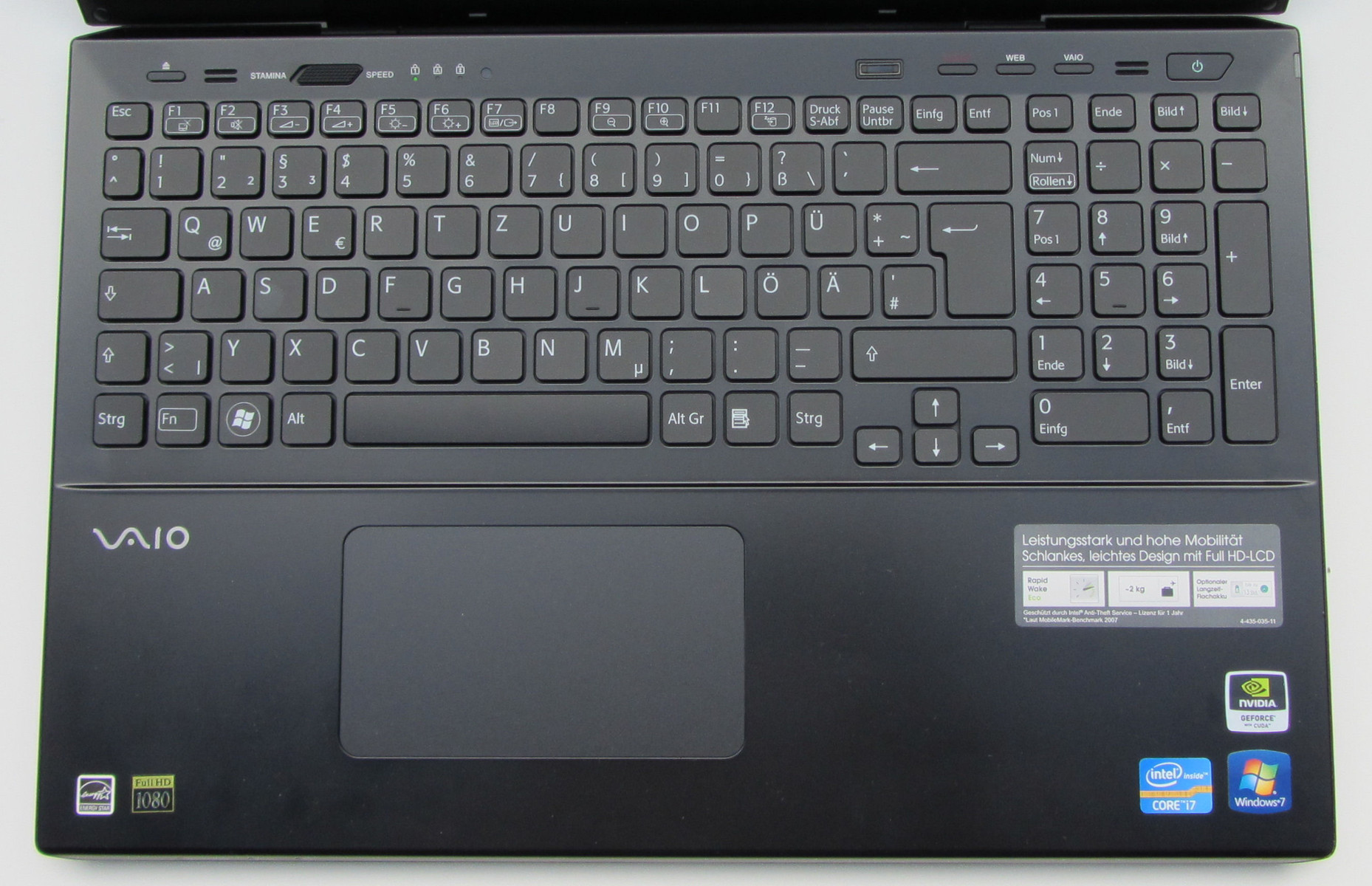 Sony verbaut eine Chiclet-Tastatur. Auch ein Nummernblock hat noch Platz gefunden. Die Haupttasten haben eine angenehme Größe von 15 mm x 15 mm. Der Abstand zwischen den Tasten beträgt 4 mm. Der Tastenhub ist ausreichend. Der Druckpunkt der Tasten ist erkennbar. Trotzdem könnte er eine Spur knackiger sein. Das würde den Schreibkomfort erhöhen. Die Tastatur biegt durch, wenn man auf ihr tippt. Hier erwartet man mehr Stabilität. Alles in allem liefert Sony hier eine durchschnittliche Tastatur.