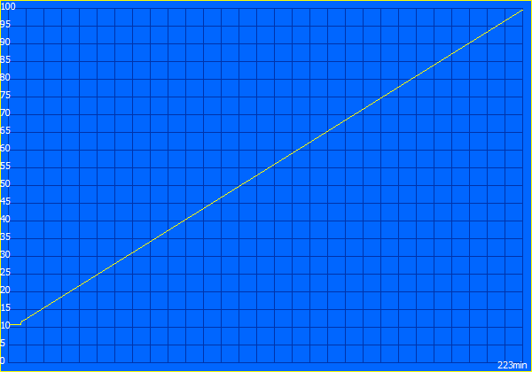 Das Playback eines DVD-Films (155 Minuten) ist kürzer als die WLAN-Laufzeit, denn diesen Test führen wir mit der maximalen Helligkeit durch (Funk deaktiviert; 230 cd/m² Mitte). Die Idle-Laufzeit (334 Minuten) ist eher theoretischer Natur, da praxisfern bei niedrigster Helligkeit lediglich ein TXT-File rauf und runter gescrollt wird.