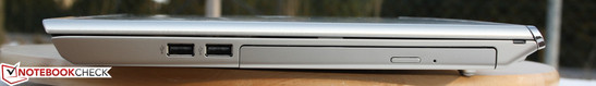 Was die Anschlüsse angeht, setzt Sony auf die übliche Standardkost: VGA und HDMI sind an Bord, dies ist, bis auf Inspiron 15R (nur HDMI), bei allen obigen Full-HD-Konkurrenten der Fall. Auf den Ethernet-Port verzichtet das Vaio nicht, dafür aber auf ein Kensington Lock. Die Frontseite beherbergt gleich zwei Kartenleser: Den Sony eigenen Standard Memory Stick (Pro/Duo), sowie einen Leser für SD-Karten.