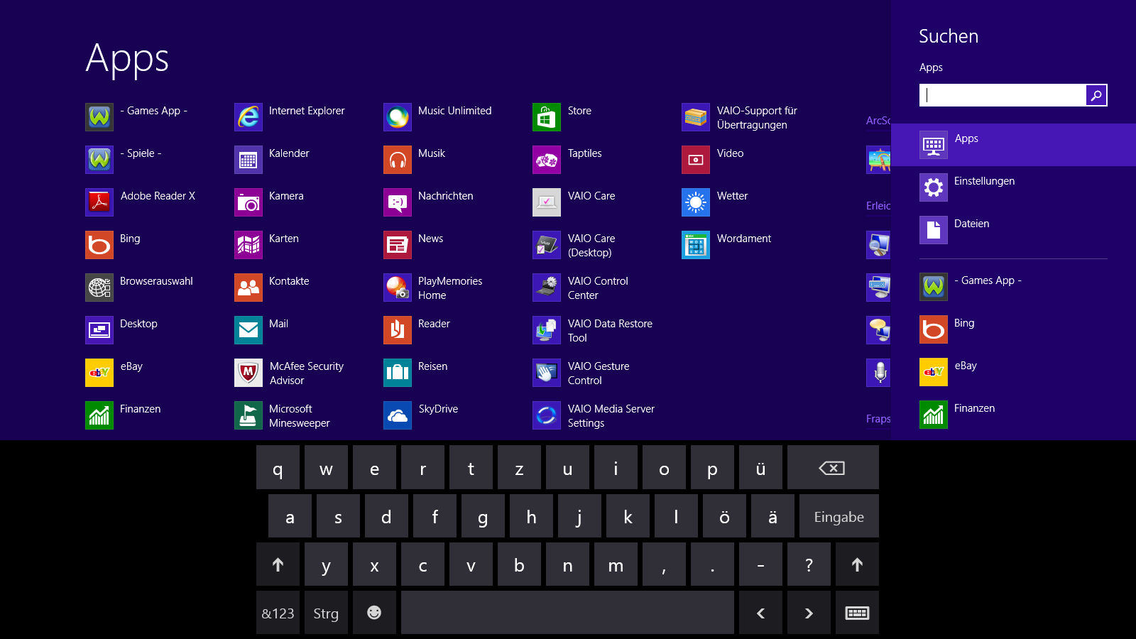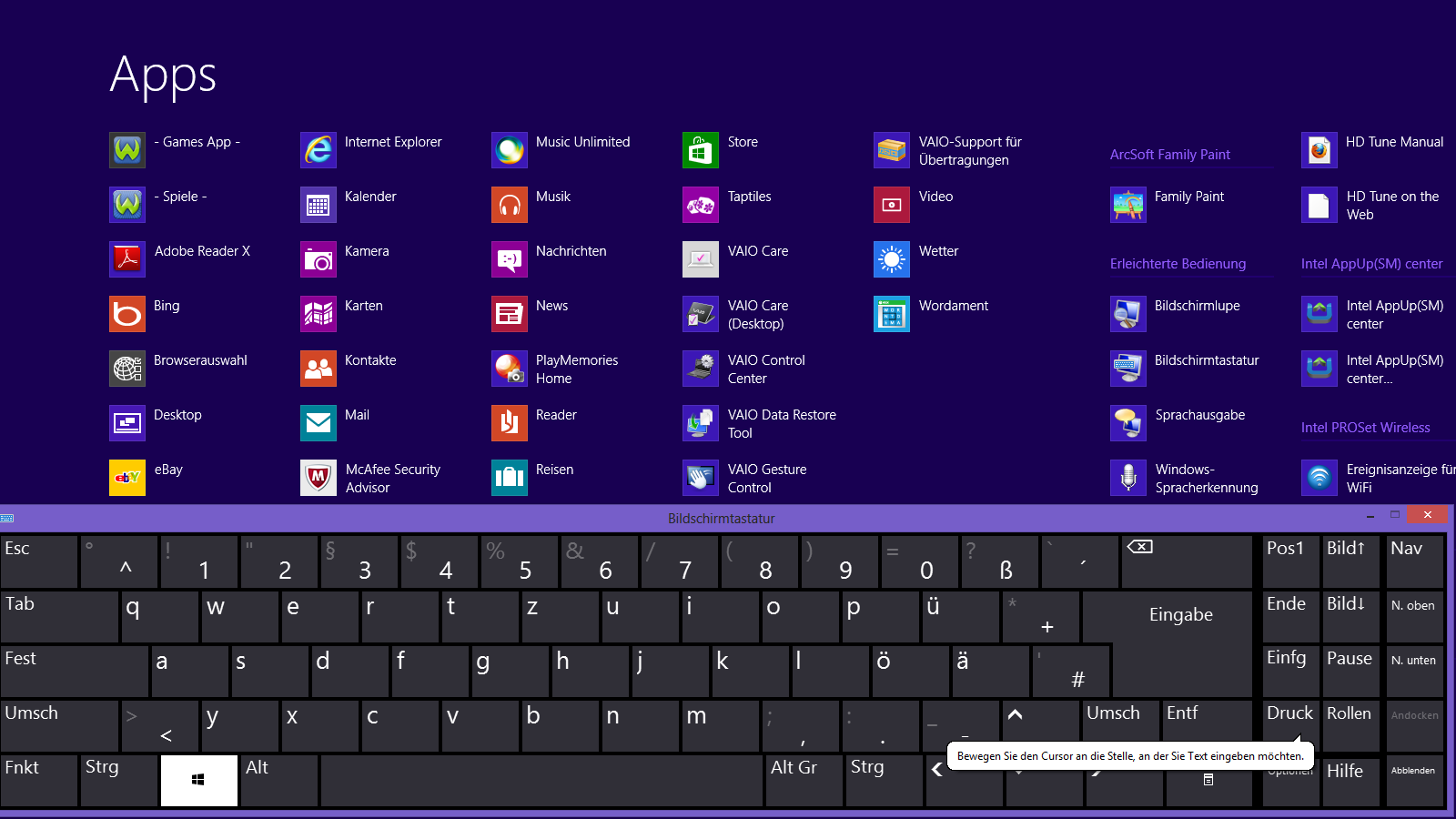 Die Bildschirmtastatur von Windows 8 lässt sich in verschiedenen Größen und mit verschiedener Tastaturbelegung darstellen. Zudem lässt sie sich manuell an die Bildschirmgröße anpassen. Dadurch hat man besonders große Tasten zur Verfügung, mit denen sich grundsätzlich auch längere eMails gut tippen lassen könnten. Leider wird man das Sony Vaio Tap 20 aufgrund der Größe eher seltener auf dem Schoß liegen haben. In aufgestellter Position greift man andererseits doch lieber zur externen Version, da es sich aufgrund der normaleren Handhaltung hiermit deutlich angenehmer schreiben lässt.