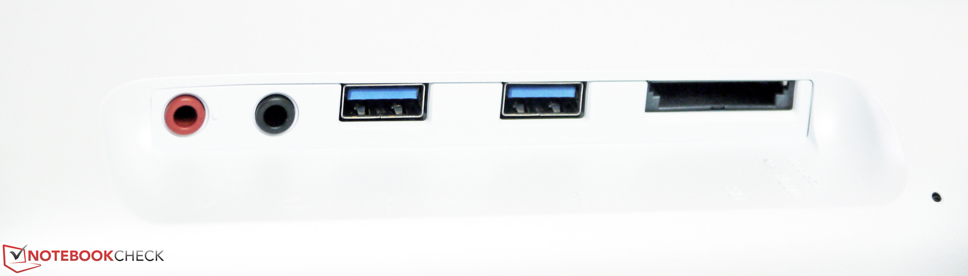 Die Schnittstellenausstattung bietet 2 x USB 3.0, einen Cardreader und Gigabit-LAN. Einen Videoausgang oder sonstige Anschlüsse sucht man hingegen vergebens. Wenigstens eine Möglichkeit externe Bildschirme oder Fernseher anbinden zu können, wird sich mancher Anwender wünschen. Die Abstände zwischen den beiden USB-Anschlüssen sind ausreichend groß, um auch breite DVB-T-Sticks gleichzeitig mit anderen Erweiterungen nutzen zu können. Speicherkarten und USB-Kabel müssen jedoch anders als sonst je mit dem Rücken zum Anwender hin eingeschoben werden. Das geht zudem recht hakelig vonstatten. Orientierungspunkte auf der Vorderseite, um die richtigen Anschlussstellen zu finden, fehlen. Eine externe Seagate GoFlex-Festplatte hat am USB 3.0-Port Übertragungsraten von knapp 80 MB/s geliefert und eine Sandisk Extreme Pro SDHC wurde mit 41,7 MB/s gelesen. Der untere (in der Ansicht links) der beiden USB-Anschlüsse verfügt über eine Ladefunktion, um externe Geräte wie Smartphone oder MP3 Player aufladen zu können.