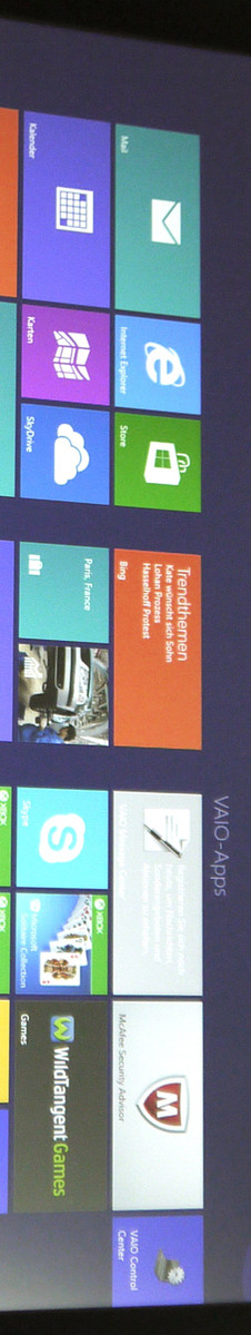Das Sony Vaio Tap 20 ist mit einem spiegelnden 20-Zoll-IPS-Display ausgestattet. Es verfügt über eine Auflösung von 1.600 x 900 Bildpunkten und hat damit eine Punktdichte von 91 dpi. Einzelne Pixel sind gut sichtbar und die Darstellung wirkt etwas grob. Die geringe Pixeldichte geht zwar einerseits recht verschwenderisch mit der verfügbaren Bildschirmfläche um, andererseits sind Schriften, Symbole und Icons so groß dargestellt, dass man mit einer sehr angenehmen Fingerbedienbarkeit entschädigt wird. Alternative Auflösungen bietet Sony derzeit nicht an.