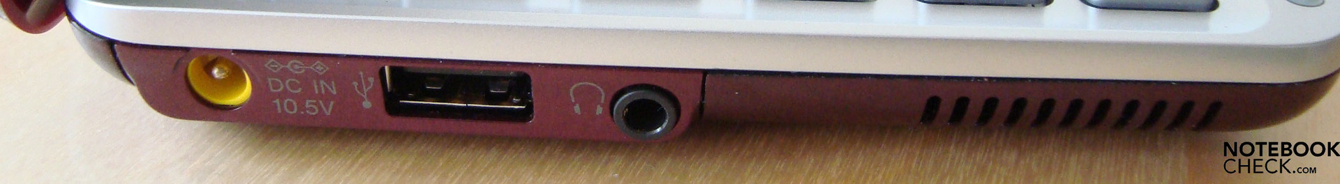 Die linke Seite wird vom Netzstecker, einem weiteren USB Port und dem Audioausgang zum Anschließen der Kopfhörer okkupiert.