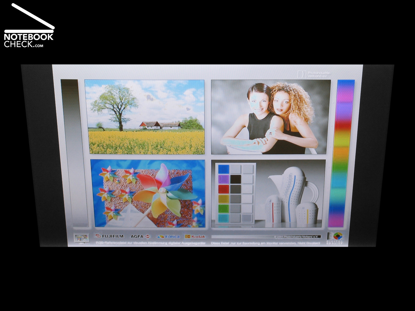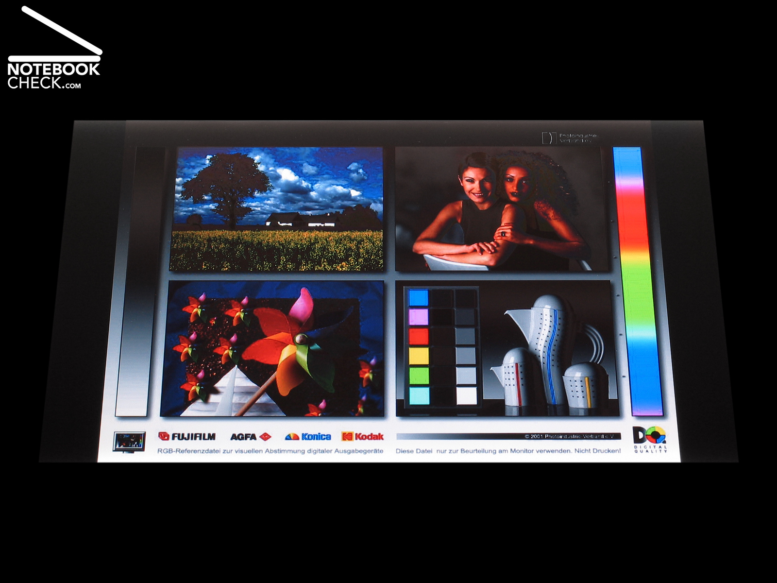 Im direkten Sichtvergleich zu unserem 20-zölligen Referenzdisplay Viewsonic VP2030b gefällt ebenfalls die subjektiv brillante und nicht übertrieben „bunte“ Wiedergabe der Testbilder. Allerdings wirken die, hinsichtlich Farbneutralität schwierigen, Portraitfotos auf dem WXGA-Display des VGN-SZ71WN/C im direkten Sichtvergleich zum MVA-LCD Viewsonic VP2030b deutlich zu „kühl“ (Farbdrift zu Blau). Bei der Beurteilung der möglichen Blickwinkel vergeben wir ein „gut“. Abstriche sind lediglich bei der Darstellung von Farbverläufen zu machen. Wie bei Notebook-Panels üblich, ist bei Halbtönen „Dithering“ festzustellen. Zusätzliche Informationen zur Displaybewertung finden Sie auch im Testbericht zum Sony Vaio VGN-SZ61WN/C.