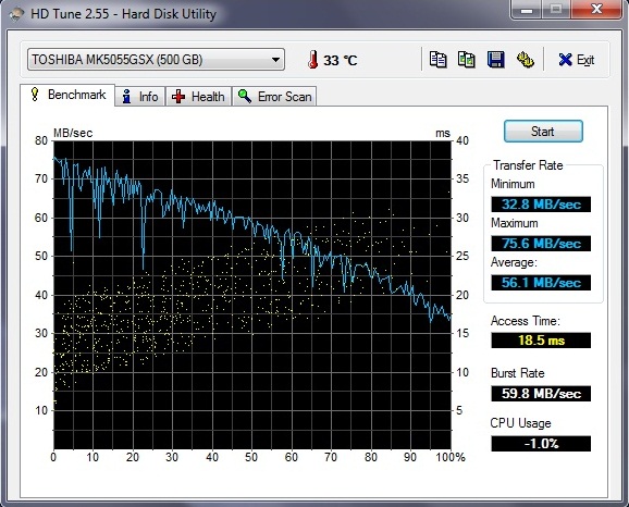 Bei der Festplatte setzt Sony auf Hersteller Toshiba und stattet das Vaio VPC-EB1S1E/BJ mit einer 500 GByte großen HDD aus. Diese dreht mit 5400 U/min und liefert ordentliche Werte. So beträgt die Übertragungsrate laut des Tools HDTune zwischen 32.8 und 75.6 MB/Sek, wobei im Mittel passable 56.1 MB/Sek erreicht werden. Spitzenreiter kommen hier auf 70 oder sogar 80 MB/Sek. Mehrere Partitionen sucht man auf der Festplatte indes vergebens.