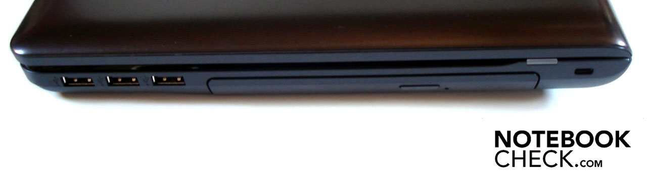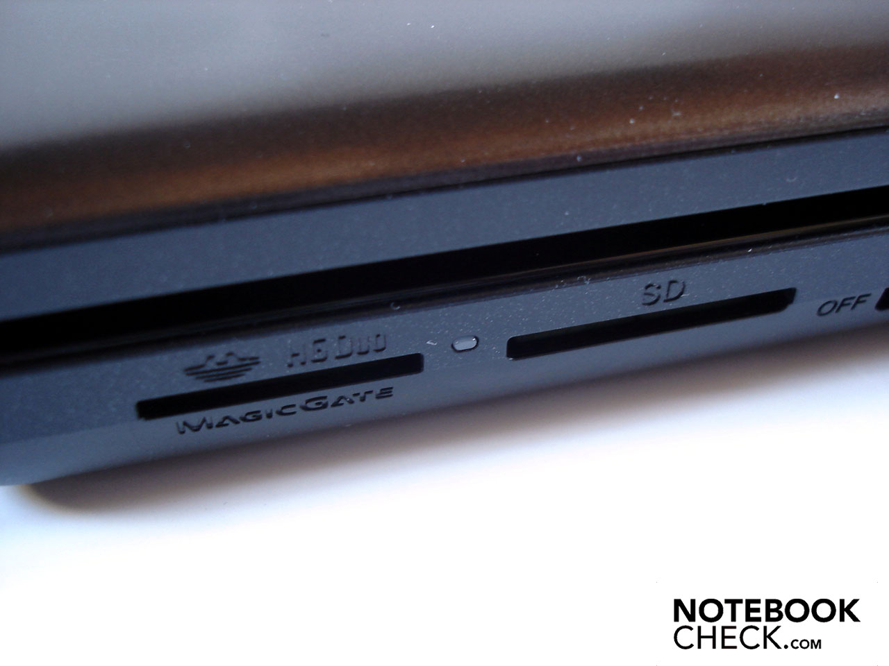 Auf der Vorderseite befinden sich darüber hinaus gleich zwei Kartenleser. Einer ist für Sony´s eigene Formate (MS) gedacht, der andere dient für SD-Karten. Gleich daneben versteckt sich ein praktischer Schieberegler, mit dem das integrierte Wlan sowie Bluetooth aktiviert bzw. deaktiviert werden kann. Zusätzlich warten am rechten Ende der Vorderseite noch zwei Soundanschlüsse (Kopfhörer/Line-out, Mikrofon/Line-in), über deren Positionierung sich vortrefflich streiten lässt. Indiskutabel ist dagegen die Anschlussanordnung auf der rechten Seite. Direkt drei USB 2.0-Ports in den vorderen Bereich zu setzen ist mehr als unpraktisch. Wer viele Kabel angeschlossen hat und eine Maus einsetzt, wird (wie auch auf der linken Seite) deutlich in seiner Bewegungsfreiheit eingeschränkt. Abgesehen davon befinden sich neben den USB-Ports das optische Laufwerk (in unserem Fall ein unspektakulärer DVD-Brenner) und ein Kensington Lock.