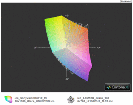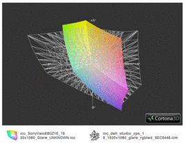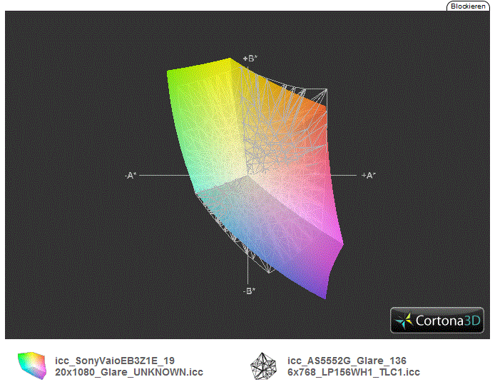 Für Profi-Anwender der Bild- und Videobearbeitung zählt aber nur die Farbraumabdeckung. Der definierte sRGB-Farbraum (t) kann beinahe abgedeckt werden, weshalb man dem Panel einen erweiterten Farbraum zusprechen kann. 08/15-Consumer-Panels, wie im Acer Aspire 5552G, (t) haben einen deutlich kleineren Farbraum. An Workstation-Profi-Displays (z. B. Lenovo Thinkpad W510 mit RGB-Display; oder Dell Studio XPS mit RGBLED (t)) kommt das nicht auslesbare Panel aber nicht heran.