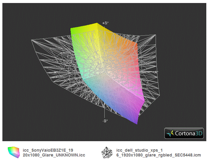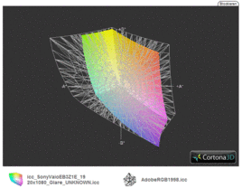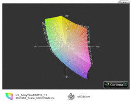 Kurz: Das Full-HD Panel ist vertikal deutlich besser als die meisten Consumer Panels. Das muss hoch angerechnet werden, denn 80 Prozent unserer Testnotebooks haben sehr kleine Blickwinkel. An die farbliche Stabilität eines Desktop-TFTs (Farben aus allen Positionen konstant), kommt das Vaio VPC-EB3Z1E/BI allerdings nicht heran.