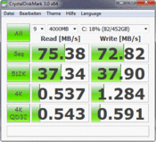 Der 500 GByte Festspeicher des Herstellers Samsung (HM500JI) arbeitet passabel schnell, ist aber nicht rasant. Es handelt sich um eine mit 5.400 rpm drehende HDD. Sie liest mit 65 MByte/s im Sequential Read (HD Tune). Der Crystal Disk Mark 3.0 liegt mit 75 MByte/s deutlich höher, was aber durch eine anderen Test-Routine erklärt werden kann (10 MByte/s Differenz ist immer vorhanden). Der HDD-Score des PCMark Vantage liegt bei immer noch gemächlichen 3.094 Punkten (Sub-Score). Erst schnelldrehende 7.200 rpm HDDs bringen höhere Durchsätze ein, was dann bspw. in einem HDD-Score von 4.077 Punkten (HP G62-130EG) resultieren kann.
