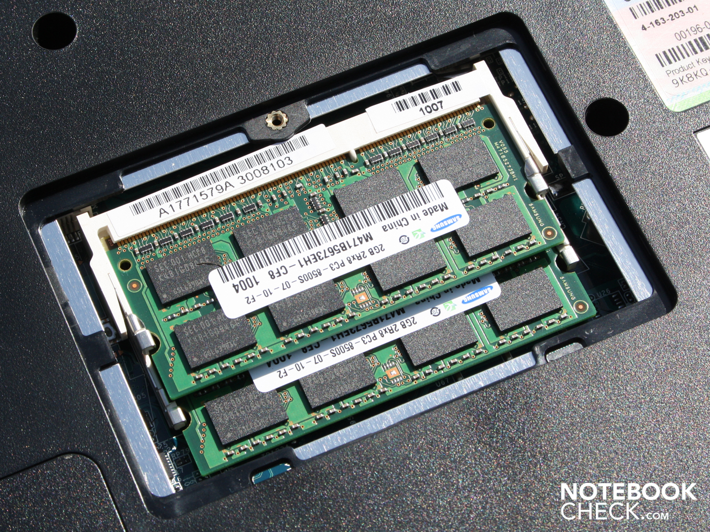 Die Unterseite gibt Zugang zu Festplatte und Arbeitsspeicher. Während der DDR3-RAM in zwei Slots zu je 2.048MB sitzt, gibt es bei der Festplatte noch freie Plätze. Auf einer Art Rahmen ist die 2.5-Zoll HDD verschraubt und per Flachbandkabel mit dem SATA-Controller verbunden. Daneben wäre noch Platz für eine zweite HDD. Für selbige gibt es aber kein Anschlusskabel. Der Traum von der Dual-HDD in Sonys 17-Zoller ist damit ausgeträumt.