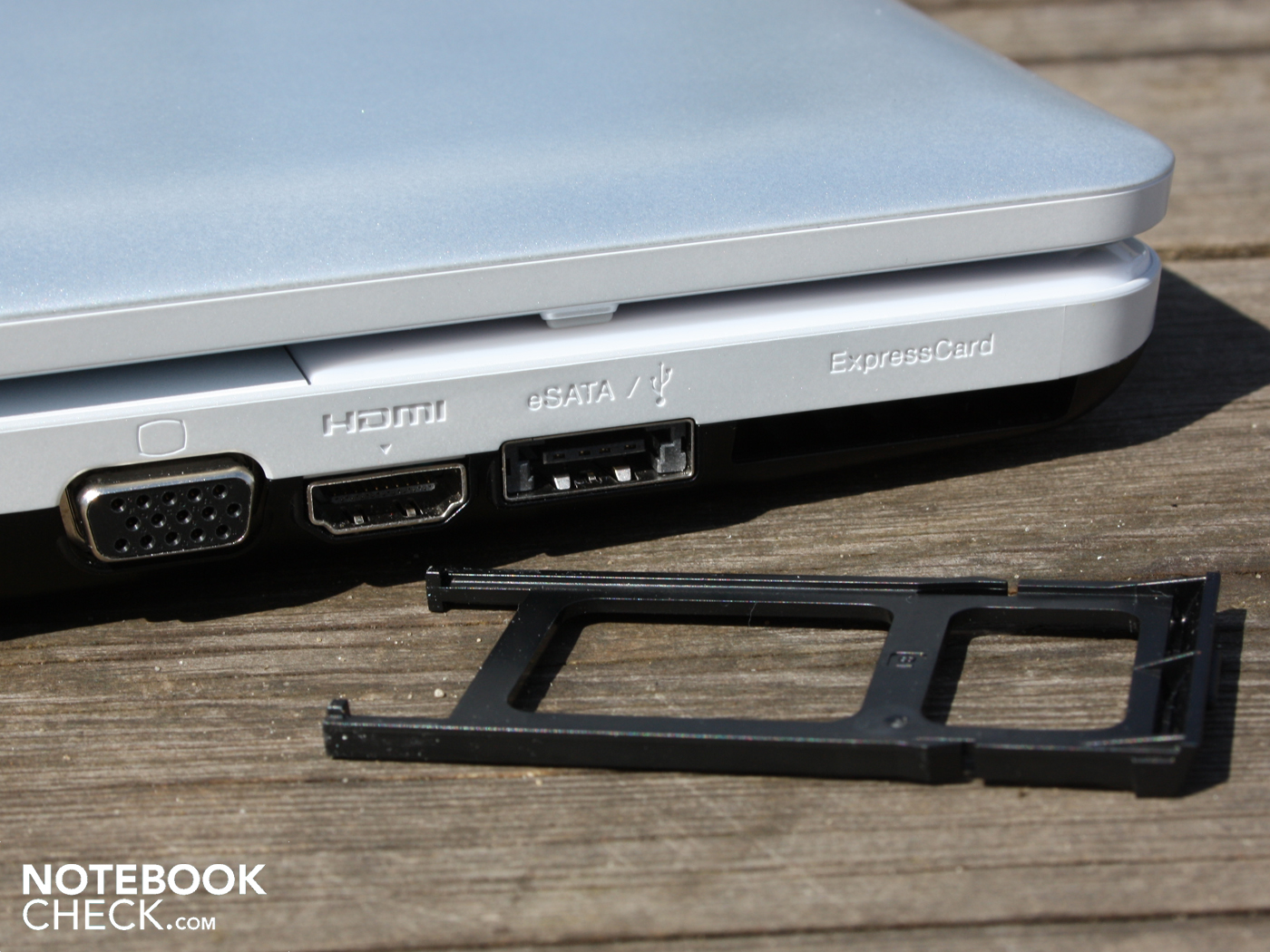 Die Anordnung der Steckplätze könnte problematisch werden. VGA sitzt so dicht neben HDMI auf der linken Seite, das es unmöglich ist, beide Verbindungen gleichzeitig zu verwenden. Die frontseitig orientierte Anbringung der Stecker könnte die Benutzung einer Maus stören. Wer sich hierbei erst durch sperrige eSATA- oder einen Strang von USB-Kabeln kämpfen muss, der wird bald freiwillige das Touchpad benutzen. Selbstredend gilt das nur, wenn Kabel angeschlossen sind. Anschlüsse an der Rückseite wären für den stationären Einsatz am heimischen Schreibtisch besser gewesen. Gerade wuchtige und sperrige Kabel wie VGA, eSATA und HDMI sind dort am besten aufgehoben. Das tief sitzende Display wäre dann aber nicht mehr machbar gewesen.
