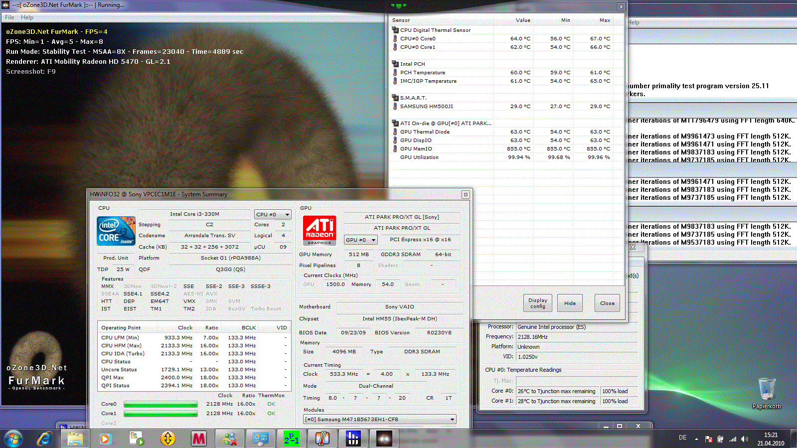 Im Stresstest wird der Vaio EC1 auf dem Prozessor maximal 67 Grad Celsius warm (Temperatursensoren). Die Grafik bringt Stress auch nicht zum Kochen. Der GPU Core Sensor meldet maximal 63 Grad.