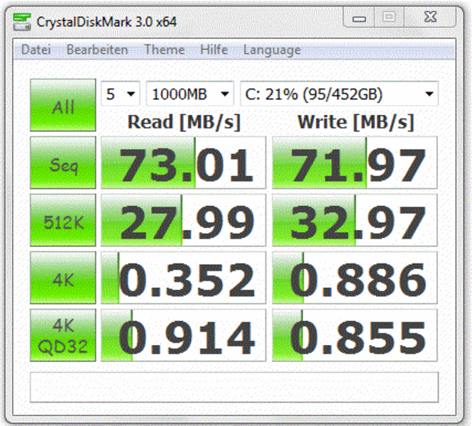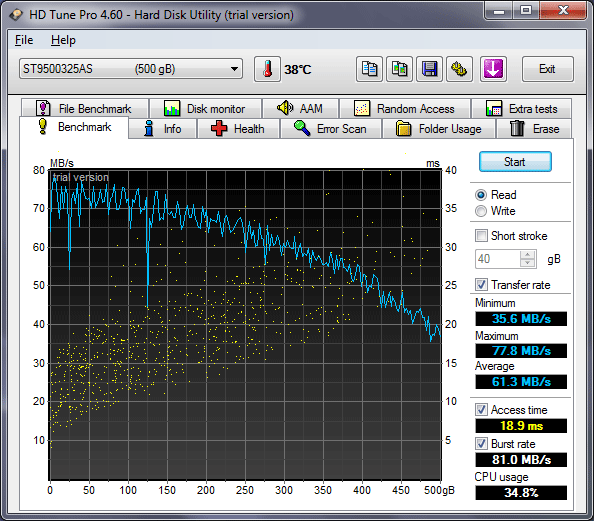 Als Festplatte kommt in diesem Notebook von Sony eine Platte der Serie Momentus 5400 von Seagate zum Einsatz. Die Seagate ST9500325AS liefert eine Speicherkapazität von brutto 500 GByte und rotiert mit 5.400 Umdrehungen pro Minute. Das wirkt sich deutlich auf die Messwerte aus: Die durchschnittliche Transferrate, gemessen mit HD-Tune, lag im Test bei nur 61 MB/s. Die Burst-Rate lag bei 81 MB/s bei einer CPU-Belastung von 3,8 Prozent. Diese Werte gehen für eine Festplatte mit 5.400 U/Min in Ordnung.