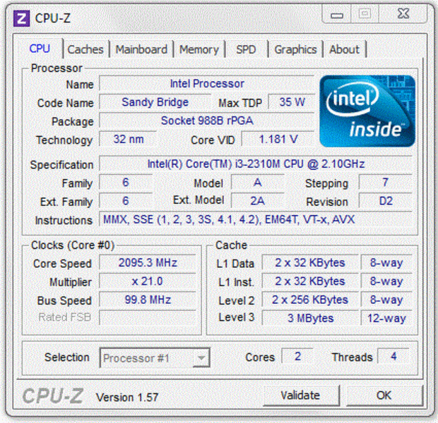 Als "Motor" kommt im Sony Vaio ein Intel Core i3 2310M zum Einsatz. Dieser ist im Gegensatz zu den i5- und i7-Modellen nicht mit der TurboBoost-Technik ausgestattet, allerdings kann auch der Intel Core i3 2310M die HyperThreading-Technik nutzen. Damit verdoppelt der Prozessor die Zahl der gleichzeitig ausführbaren Threads von zwei auf vier. Der Grundtakt des Prozessors liegt bei 2,1 GHz.