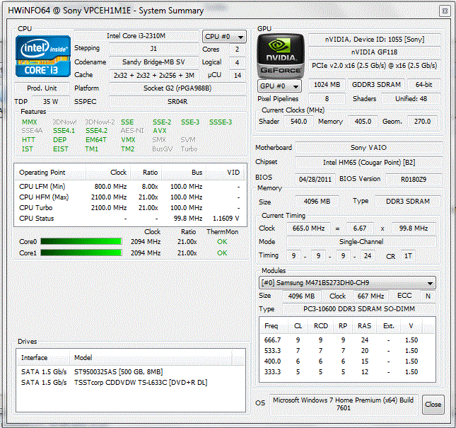 In diesem Allround-Notebook arbeitet mit der Intel Core i3-2310M eine Einstiegs-CPU der aktuellen „Sandy Bridge“-Generation, außerdem ist es mit 4 GByte DDR-3-Arbeitsspeicher und einer 500-GByte-Festplatte ausgestattet. Für die Grafikausgabe besitzt das Vaio VPC-EH1M1E/W.G4 eine dedizierte Grafikkarte aus dem Hause Nvidia vom Typ Geforce 410M, die auf 1024 Videomemory zurückgreifen kann. Die integrierte Grafikfunktion des Prozessors wird bei diesem Modell nicht benutzt.
