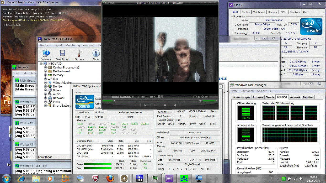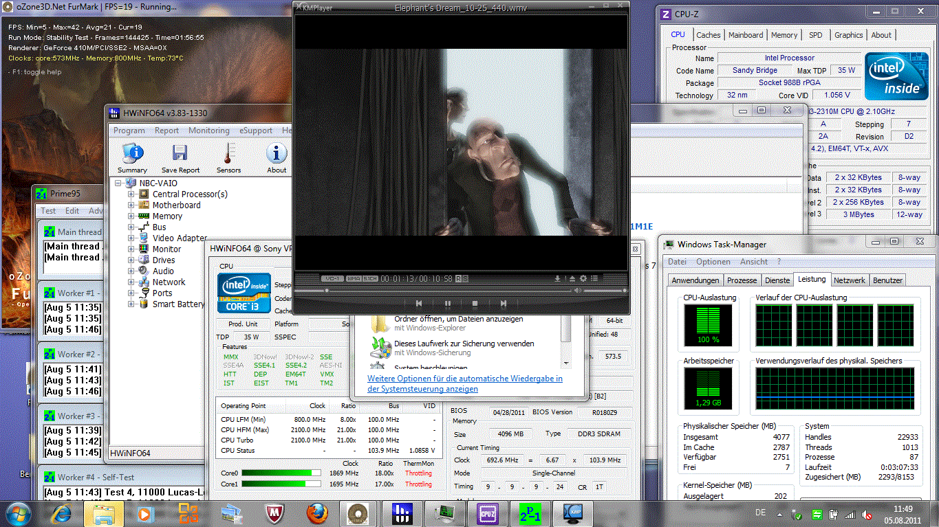 Mit verschiedenen Tools wurde, im simulierten Stresstest, dem Notebook richtig eingeheizt (CPU und GPU ausgelastet). Dies hatte zur Folge, dass die Lautstärke deutlich hörbarer wurde, auch der austretende Luftstrom wurde spürbar heißer als im Idle-Modus. Schon nach kurzer zeit konnten wir mittels HWInfo beobachten, dass sich der CPU-Takt nach unten bewegt und zwischen 1600 und 1800 MHz einpendelte. Dies liegt unter dem Basistakt der 2310M CPU (2.1 GHz), insofern kann man von Throttling sprechen.