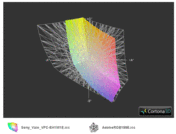 Der gemessene Schwarzwert liegt bei 1,36 cd/m², was einen schlechten Kontrast von 165:1 mit sich bringt. Zwar wirken die Farben auf dem HD-Display sehr intensiv, Schwarz ist aber bereits etwas angegraut. Für ein professionelles Arbeiten (Bildbearbeitung, Grafik,...) ist der gemessene Farbraum nicht geeignet. Wie die Screenshots zeigen, ist etwa der sRGB Referenzfarbraum mit dem Farbraum des Vaio nicht einmal ansatzweise deckungsgleich.