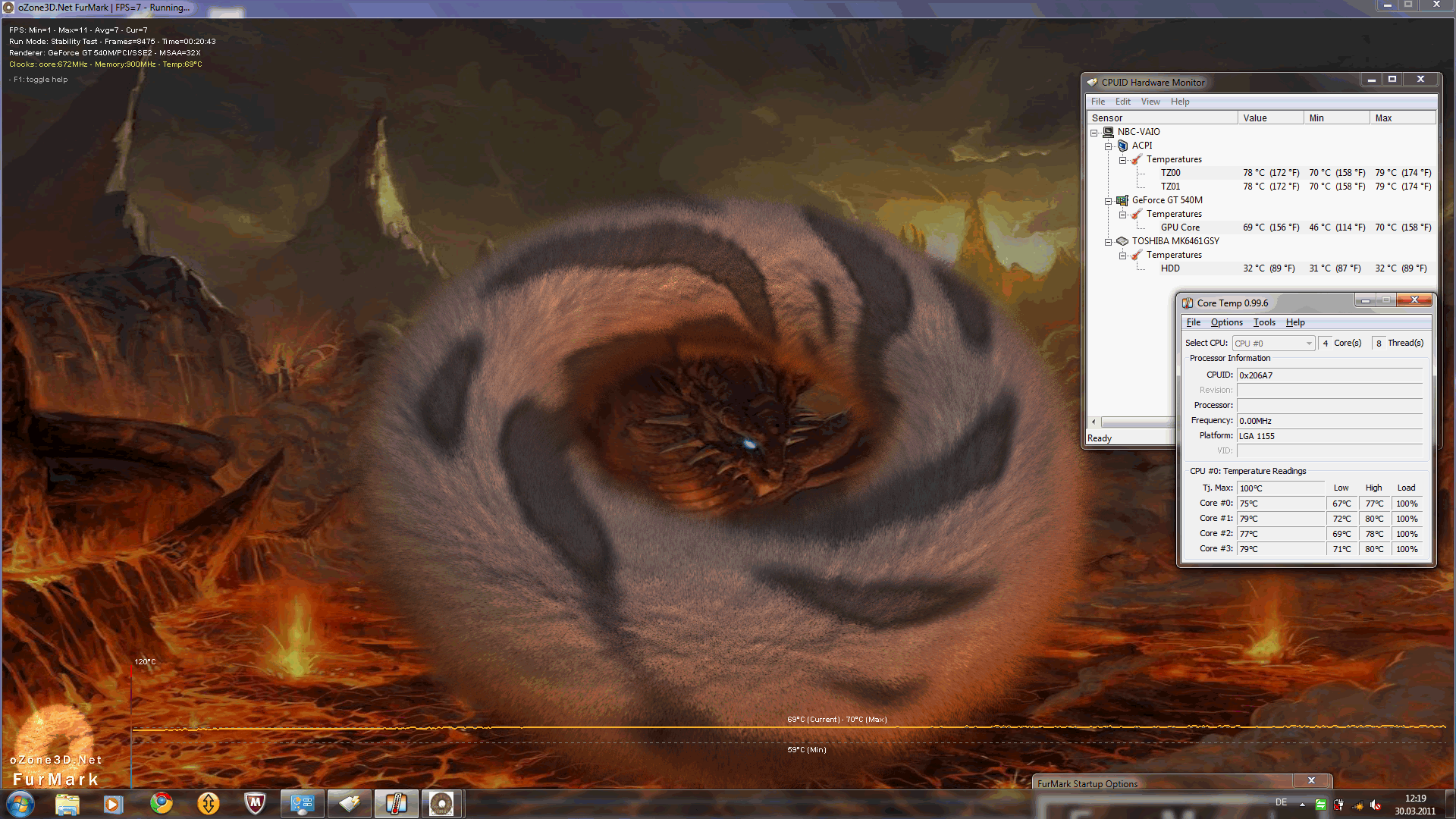 Über die reine CPU-Geschwindigkeit geht die Arbeitsgeschwindigkeit hinaus. Der PCMark Vantage endet auf 7.312 Punkte. Das ist ein typischer Wert für diese Hardware. Zum Vergleich: Ein Aspire 7750G mit identischem Prozessor schafft 7.402 Punkte. Nur SSD bestückte Notebooks, wie z. B. das Alienware M17x R3 (GTX 460M, i7-2630QM) oder das XMG A701 (identisch), erreichen deutlich bessere Punktzahlen (12.700 / 14.000).