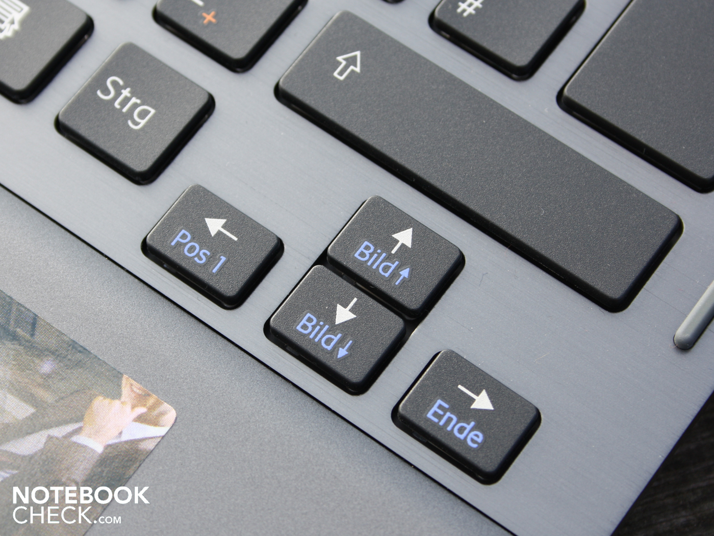 Sehr positiv: Die deutlich abgesetzten Richtungstasten und die enorm große Enter- und Shift-Taste fallen positiv auf. Finger können diese blind erfassen und es kommt selten zu Fehleingaben. Zu Gunsten der Tastengröße hat Sony auf einen Ziffernblock verzichtet. Ziffernblock-Benutzer können per Fn+Num den markierten Nummernblock auf den Buchstabentasten einschalten.