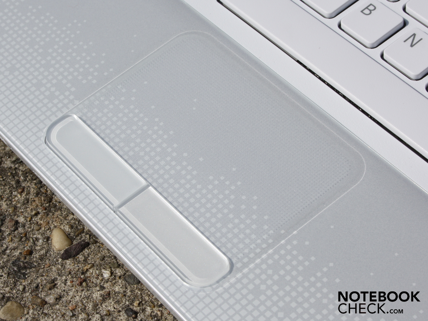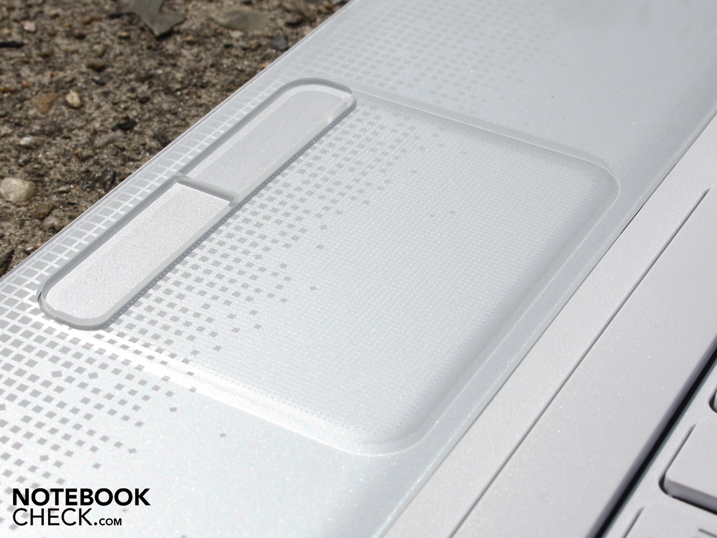 Das Touchpad besteht aus demselben Material wie die Handablage. Der Cursor bewegt sich zielgenau, wenn wir über die mit kleinen Noppen besetzte große Fläche gleiten. Diese ist bis in den Rand sensibel. Eine schmale, flache Kante trennt die Touch-Fläche von der Handablage. Das Pad ist nicht per Fn-Taste abschaltbar. Es handelt sich um ein Multi-Touch Pad Synaptics V7.4. Der Mausersatz erkennt den Einsatz von zwei Fingern. Dadurch kann der Nutzer, zum Beispiel im Word-Dokument, vergrößern oder verkleinern oder nach Unten oder Oben rollen.