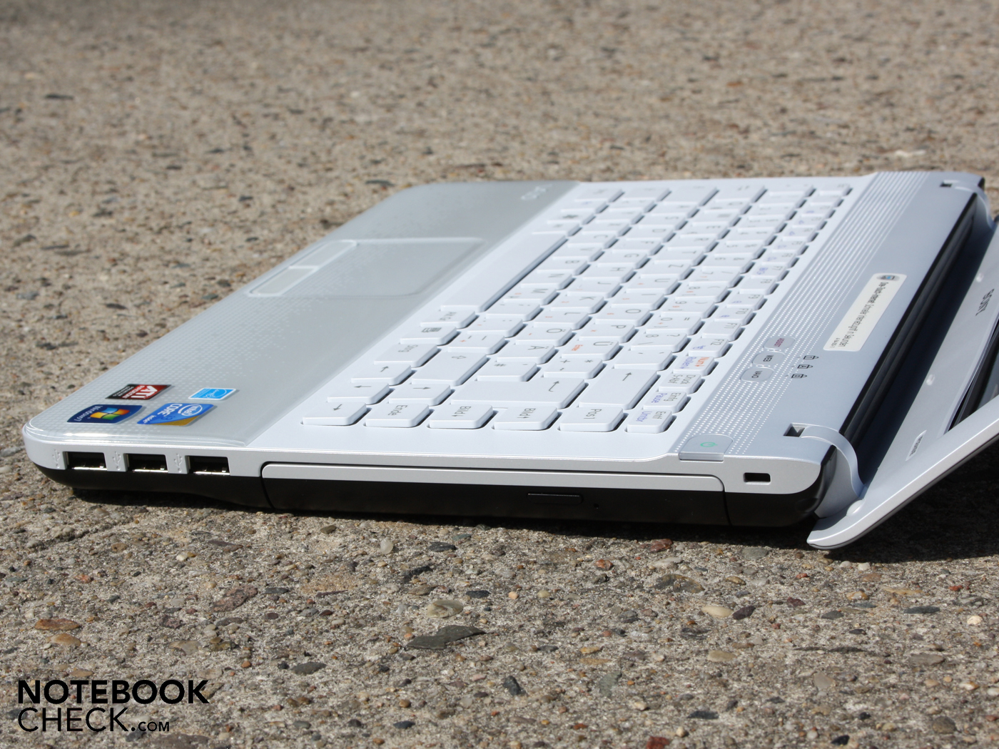 Bei den Anschlüssen nutzt der Hersteller die zur Verfügung stehende Breite auf der rechten Seite voll aus. Der 14.1-Zoller besitzt ein DVD-Laufwerk, weshalb rechts nur ein begrenztes Platzangebot zur Verfügung steht. Sony entschied sich hier für drei nebeneinander liegende USB-Ports. Mit einem großen Abstand sollten auch breite USB-Sticks oder Winkelstecker Platz finden.