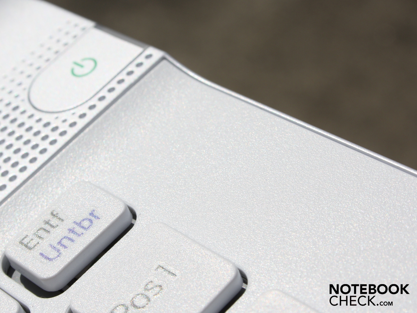 Bislang hat nur Samsung mit dem R580 bzw. N220 ein ähnlich farbenfrohes Notebook/Netbook auf dem Markt, dass dieselbe hochwertige Oberflächenbeschichtung mitbringt. Die Oberflächen erscheinen sehr hart und kratzfest. Fingerabdrücke lassen sich gern auf den Flächen nieder, jedoch macht die weiße Hintergrundfarbe diese fast unsichtbar. Als Schwachstelle wird sich bei dauerhafter Benutzung die matt-weiße Umgebung der Tastatur entpuppen. Der leicht glatte Kunststoff wird Schmutzränder aufbauen, die vom Nutzer entfernt werden müssen, sofern er die hübsche Optik dauerhaft erhalten will. Das Abwischen mit einem Reinigungsmittel sollte auf den glatten Flächen aber nicht besonders schwer fallen.