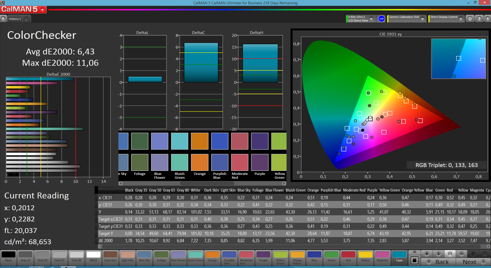Die Analyse mit dem Kolorimeter X-Rite i1pro 2 und der Software CalMAN zeigt eine zu hohe Farbtemperatur von 9.560 K (Ideal etwa 6.500 K). Dadurch driftet gerade die Darstellung von roten Farbtönen stark ab, Blautöne werden deutlich überbetont. Das mittlere DeltaE von 6,43 liegt dabei noch im Rahmen. Dennoch fällt ein leichter Farbstich ins Grün-Gelbliche auf.