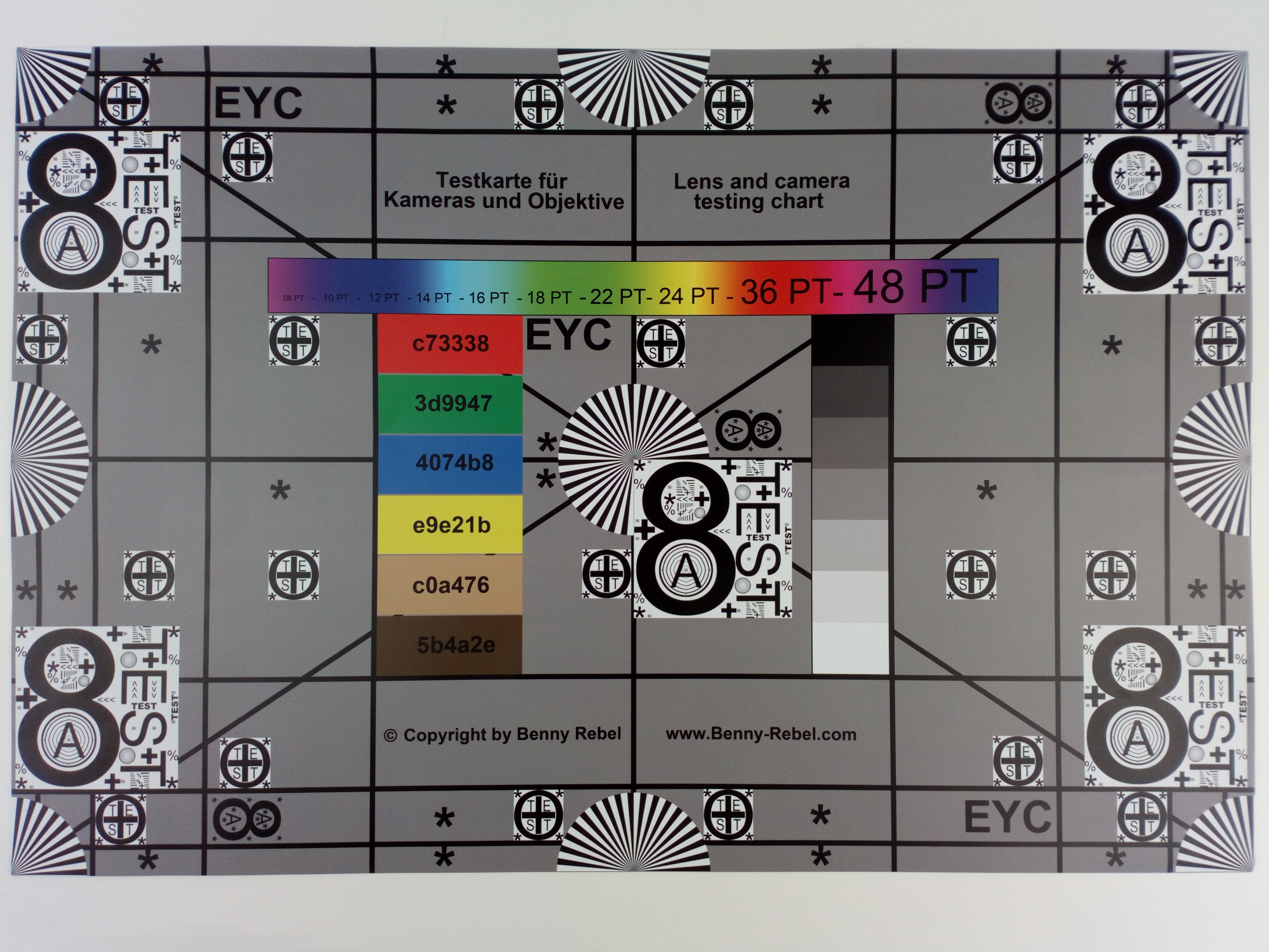 Szene 1Szene 2Szene 3Auch im Labor unter festen Lichtbedingungen muss sich die Hauptkamera beweisen, so können wir die Vergleichbarkeit der Ergebnisse sicherstellen. Beim Foto unserer Referenzkarte fällt auf, dass Flächen schnell körnig und wenig einheitlich dargestellt werden. Farben werden abgesehen davon recht natürlich dargestellt, Text vor rotem und gelbem Hintergrund wird allerdings unscharf. Bei schwarzem Text vor braunem Hintergrund fehlt der Kontrast, sodass der Text schwer lesbar ist. Die Bildschärfe ist über das Bild verteilt gleich, allerdings insgesamt nur durchschnittlich. Beim Farbvergleich fällt auf, dass Farben meist etwas zu hell wiedergegeben werden, helle Grautöne haben einen Stich ins Bräunliche.