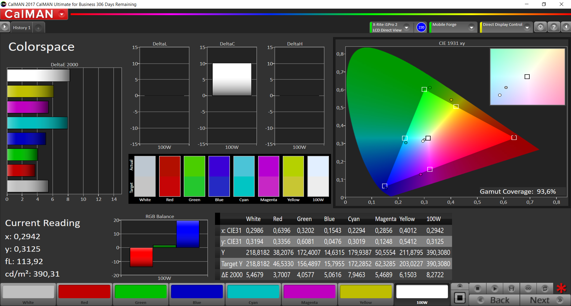 | Helligkeit Bildmitte (cd/m²) | 393 | 512 30% | 512 30% | 454 16% | 573 46% |