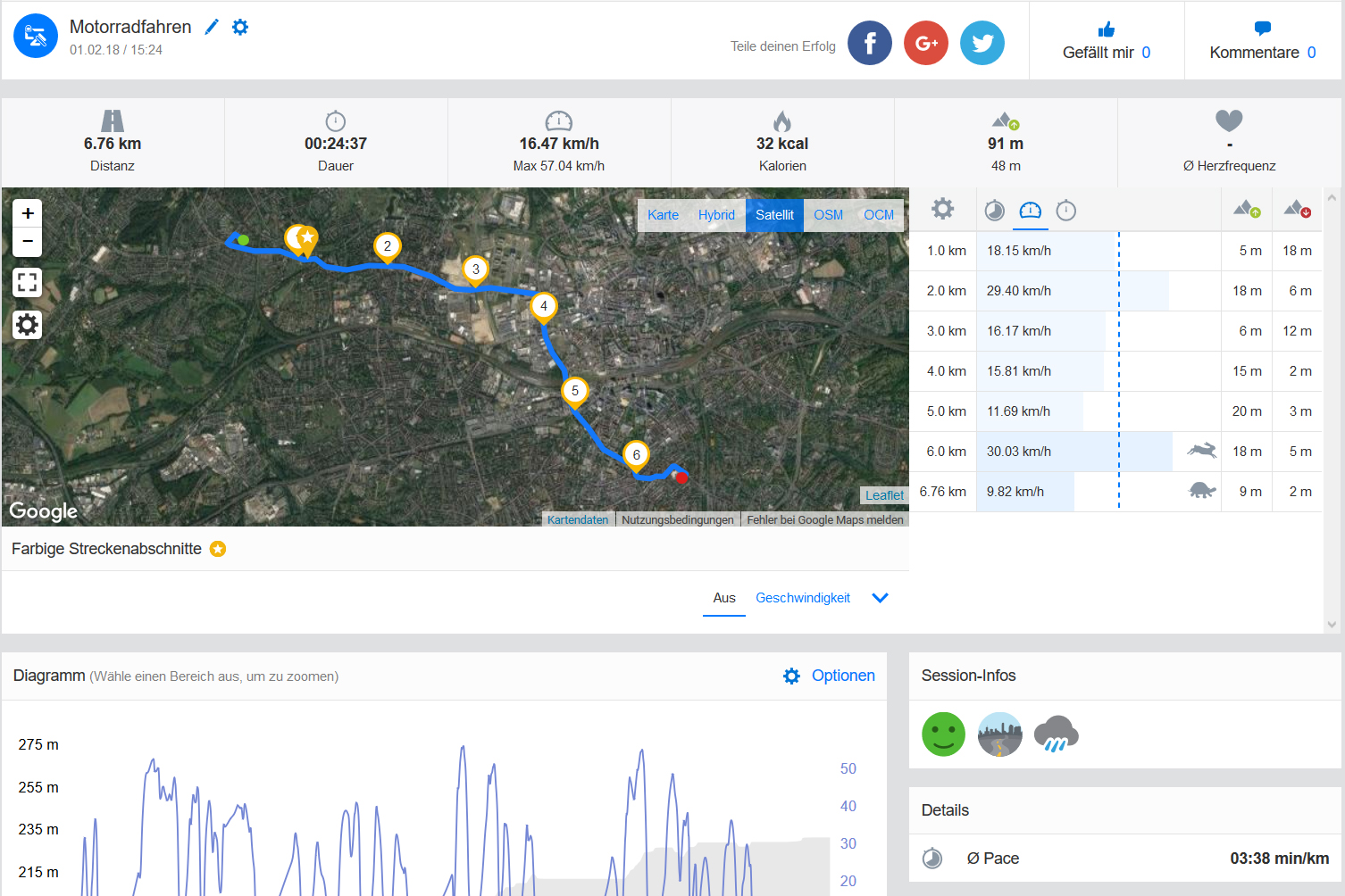 Außerdem testete unsere Redaktion die Genauigkeit der Navigation via Google Maps mit dem Sony Xperia L2 auf einer Probefahrt mit dem Motorrad im Vergleich zum Garmin Edge 500. Während das Navigationssystem auf eine Gesamtstrecke von 6,76 km kam, erreichte das Sony Xperia L2 nur 6,69 km, weil Kurven von Google Maps enger gerechnet wurden. Die Abweichung von 70 m ist bei solch einer langen Teststrecke allerdings vernachlässigbar.