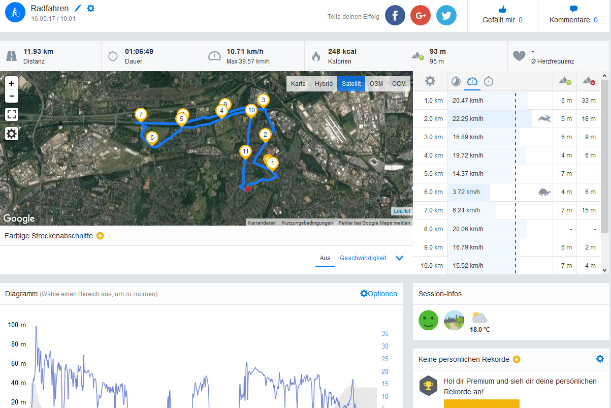 Aber kann das GPS-Modul im Xperia XA1 auch in der Praxis überzeugen? Dafür packen wir das Smartphone in einen Rucksack, legen noch das Profi-Navi Garmin Edge 500 dazu und radeln los. Die aufgezeichneten Strecken vergleichen wir mit Runtastic. Nur hundert Meter Unterschied bei der gemessenen Streckenlänge sind auf knapp 12 Kilometer Weg gar nicht schlecht. Das Xperia XA1 zeichnet den Weg zwar nicht ganz so exakt nach wie das Profi-Navi, dennoch ist die Genauigkeit für ein Smartphone beeindruckend und für den Freizeitgebrauch allemal ausreichend.