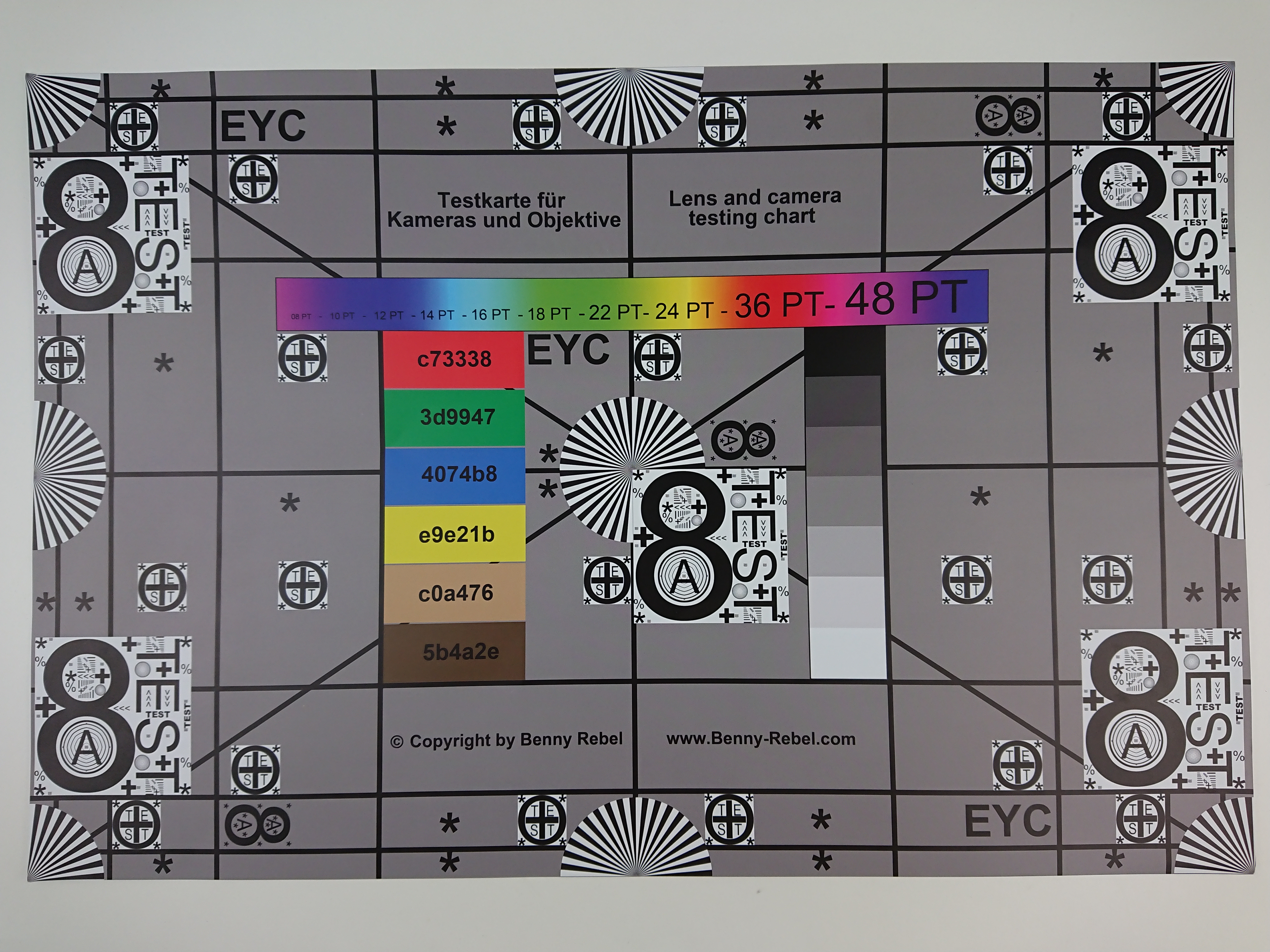 Szene 1Szene 2Szene 3Vergrößert man das Testchart, das wir unter kontrollierten Lichtbedingungen im Labor fotografieren, so erkennt man schnell, dass größere Flächen leicht fleckig wirken. Schwarze Schrift vor gelbem Hintergrund wirkt leicht unscharf, in der unteren linken Ecke entdecken wir deutliche Unschärfen. Insgesamt wird dieses Testbild aber noch gut wiedergegeben, spiegelt aber auch die Probleme, die wir bei den Testaufnahmen beobachtet haben: Farben werden mal zu dunkel, mal zu hell dargestellt, dunkle Farbtöne kommen der Referenz noch am nächsten.