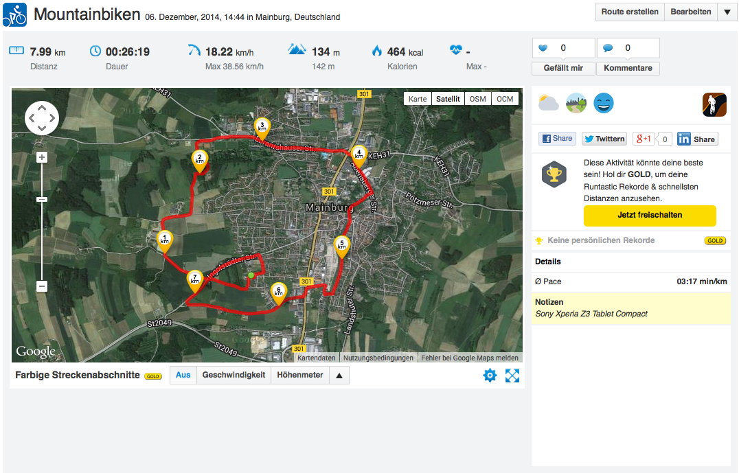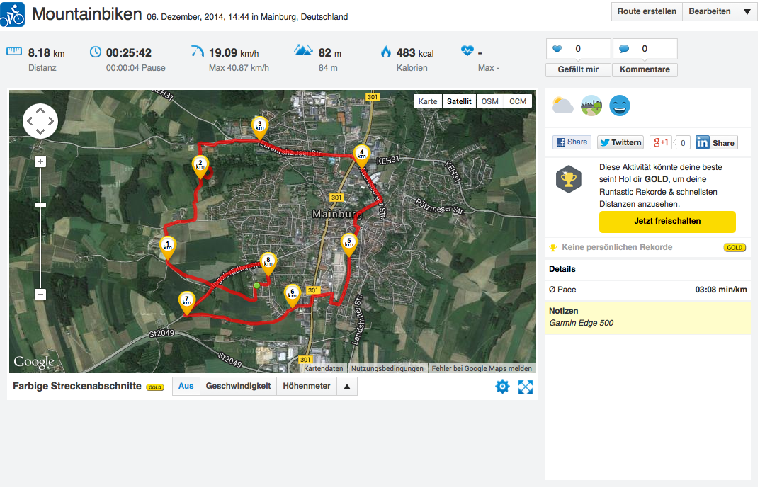 Bei der Genauigkeit zeigen sich aber dennoch ein paar kleine Schwächen. Im Vergleich zum Fahrrad-Computer Garmin Edge 500 sind die Abweichungen dann doch etwas größer, vor allem bei einer engen Straßenführung oder unter schwierigen Empfangsbedingungen wie im Wald. Die Gesamtabweichung auf der Strecke betrug jedoch nur 2,4 Prozent und liegt damit in einem guten Bereich.