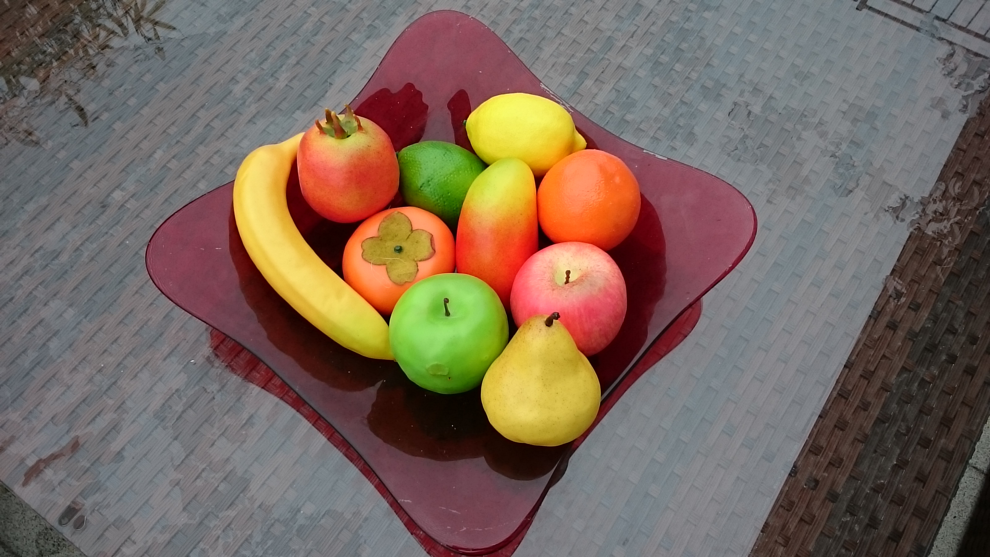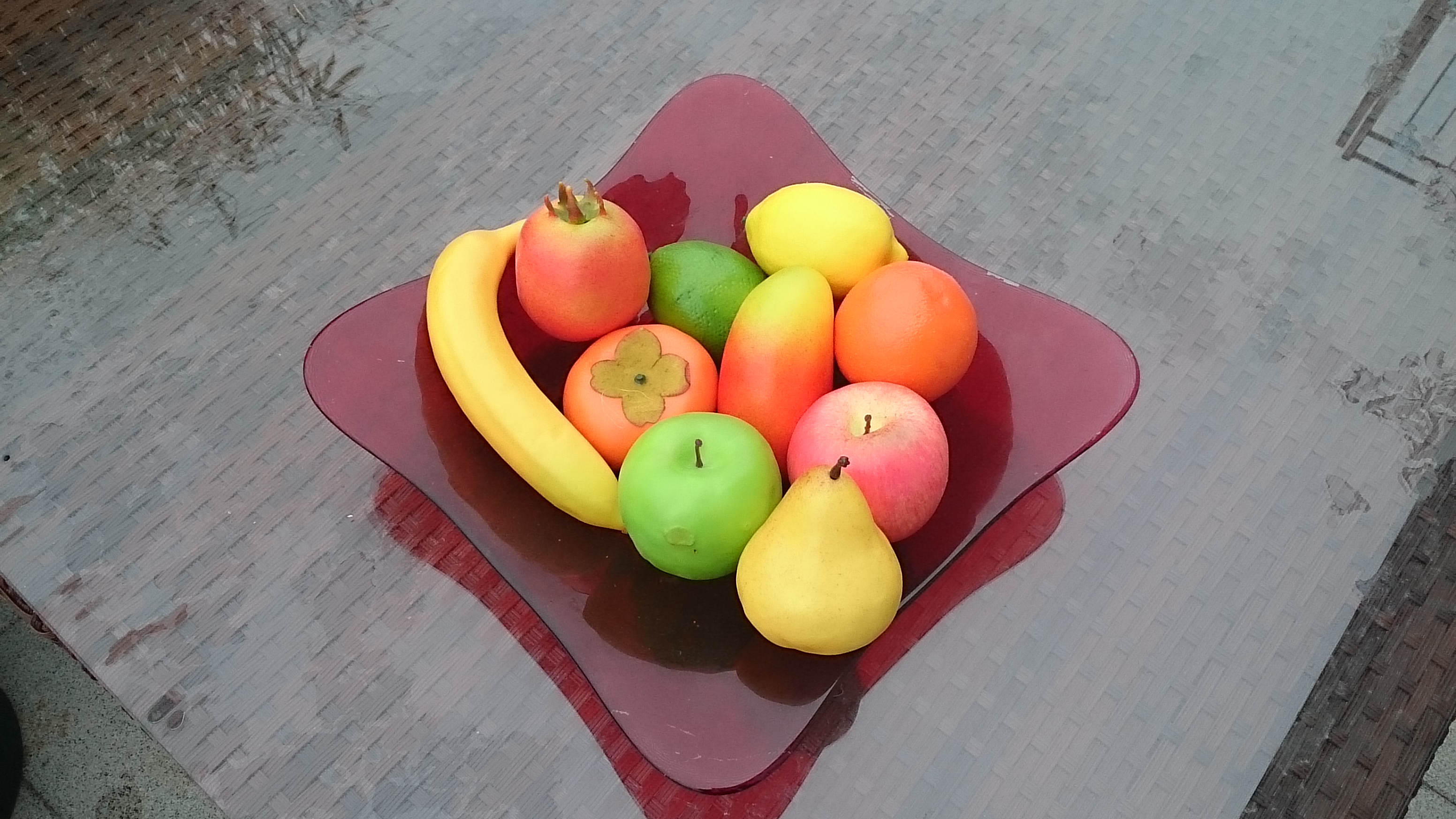 Die Aufnahmen sind bei Tageslicht recht ordentlich. Am Obst (Szene 1) ist eine minimale Überbelichtung erkennbar, welche einige wenige Details verschluckt. Die Farbwiedergabe ist leicht blaustichig und etwas zu blass, was vor allem bei der Umgebungsaufnahme (Szene 3) auffällt, außerdem werden detaillierte Flächen wie die Wiese nur als Pixelfläche dargestellt, ein einzelner Grashalm ist nicht mehr erkennbar. Dennoch gehört die Optik sicherlich zu einer der besseren in einem Tablet, wenn es sich auch mit Top-Smartphones nicht messen kann.