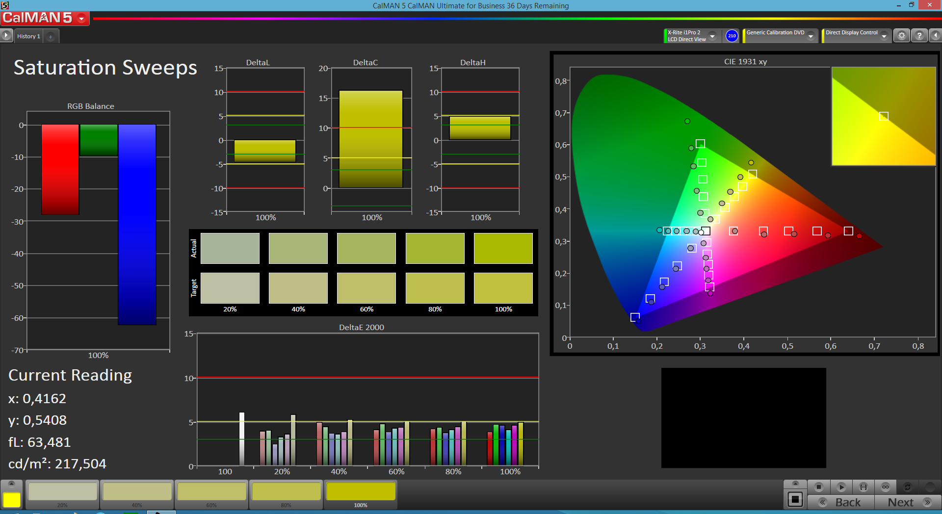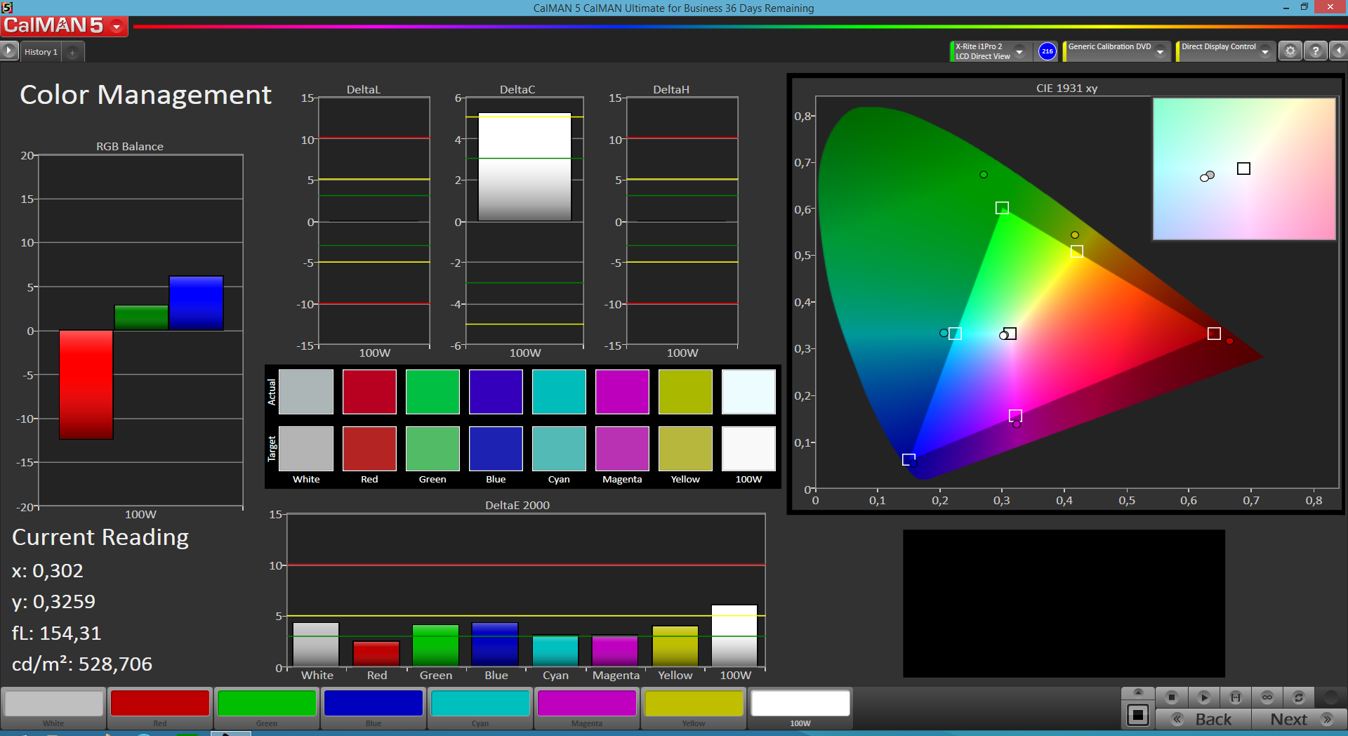 | Delta E Graustufen * | 7.04 | 2.09 70% | 2.51 64% | 3.29 53% | 3.83 46% |