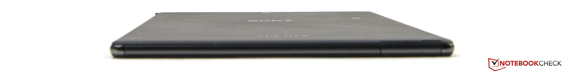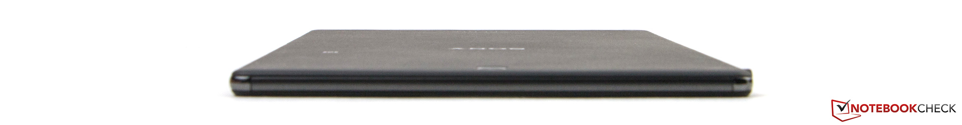 Bei der Materialauswahl setzt der Hersteller hauptsächlich auf Kunststoff. Aber der Rahmen besteht teilweise aus Aluminium und das Display wird durch ein Mineralglas geschützt, welches widerstandsfähig gegenüber Kratzern sein soll. Die Rückseite ist leicht angeraut, was für eine gute Griffigkeit sorgt. Bedingt durch die schlanke Bauweise lässt sich das Tablet relativ leicht verwinden und knarzt dabei auch hörbar. Es kehrt anschließend aber wieder in die Ausgangsposition zurück. Die Druckempfindlichkeit ist ordentlich, jedoch wird bei kräftigem Druck auf die Rückseite schnell eine Wellenbildung auf dem Panel sichtbar. Bei dem schmalen Rahmen ist da schon deutlich mehr Druck notwendig. Im Alltag wird dies bei einer normalen Handhabung jedoch nicht auffallen.