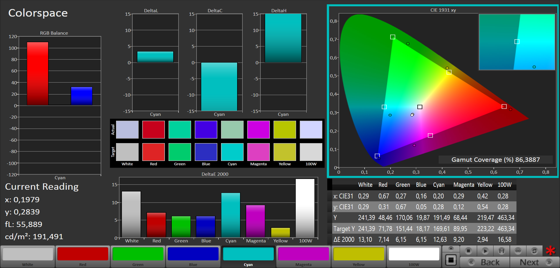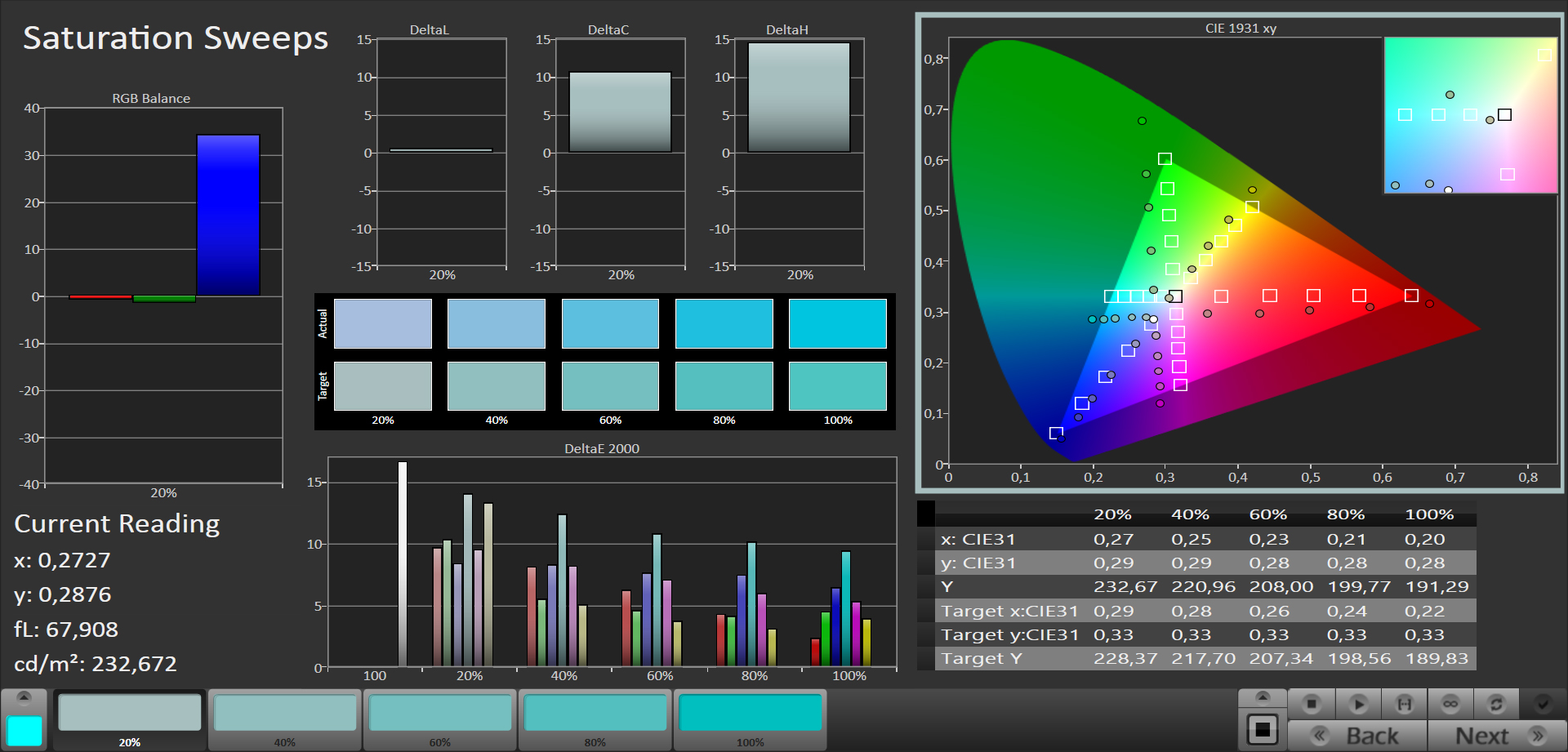 Genauere Aussagen über die Bildschirmqualität lassen sich mithilfe des Colorimeters X-Rite i1Pro 2 in Zusammenspiel mit der CalMAN Software treffen. Dabei wird im Auslieferungszustand ein fast schon brutaler Blau- bis Violettstich erkennbar. Über den Menüpunkt "Weißabgleich" lässt sich dem aber gut entgegenwirken, sodass eine weitgehend neutrale Abstimmung möglich ist. Auch bei den Grundfarben zeichnet sich im Blaubereich eine etwas stärkere Abweichung ab. Der Farbraum des Displays ist allerdings recht groß, es deckt sRGB fast vollständig ab. Die Mischfarben teilen sich das Phänomen der abweichenden Blautöne mit den Grundfarben. Die Abstimmung hat Sony also zumindest werksseitig nicht sehr gut getroffen. Auf die subjektive Bildqualität nimmt das jedoch kaum negativ Einfluss.