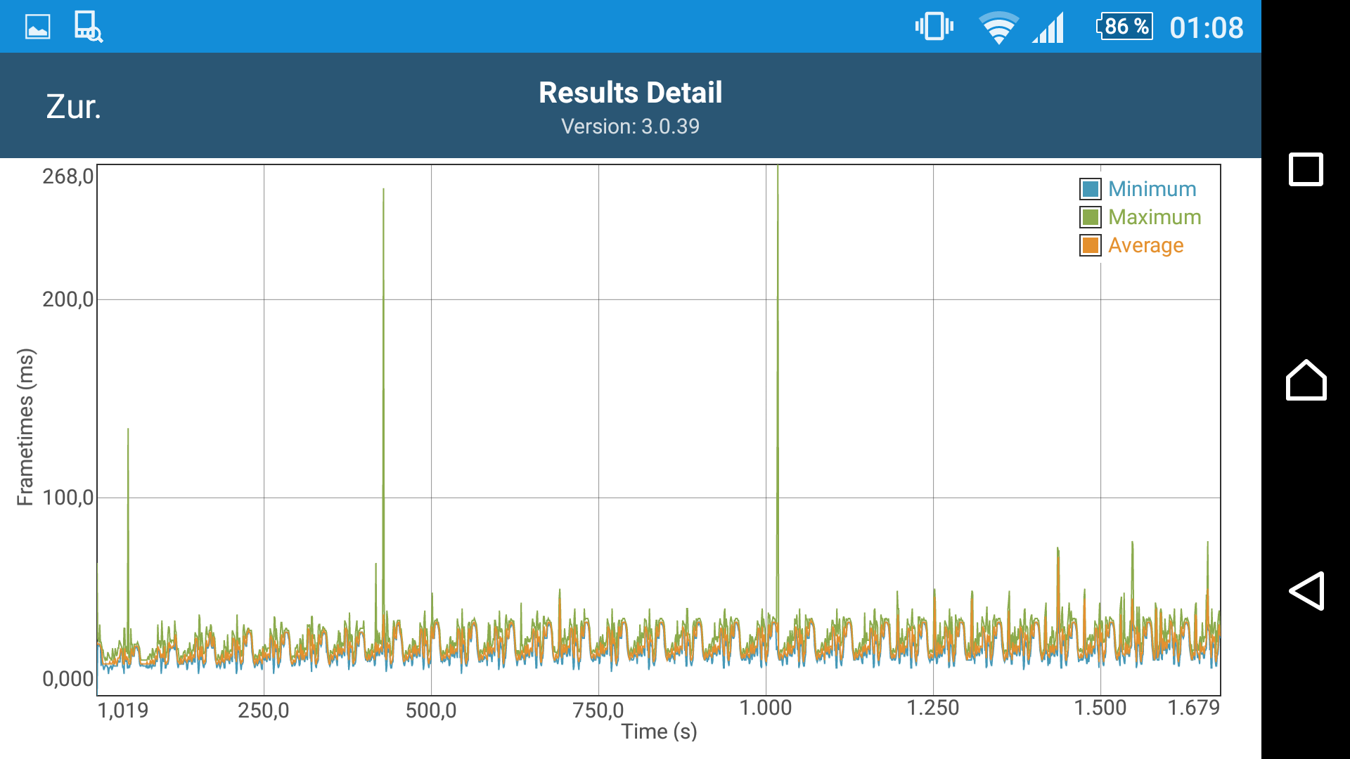 Zusätzlich haben wir mit dem Akkutest der App GFXBench 3.0 eine etwaige Drosselung der Performance getestet. Dabei wird der T-Rex-Test dreißigmal nacheinander abgespult. Zwar fällt die Leistung im Gegensatz zum Sony Xperia Z5 Compact bereits zu Beginn des Testmarathons deutlich ab, jedoch mit 30 Prozent wesentlich geringer als noch beim Vorgänger.
